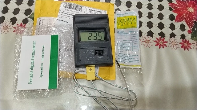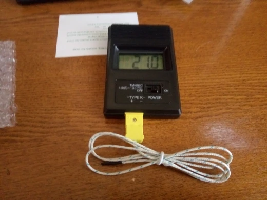 Термометр рабочий. Температуру проверял в диапазоне до 100°C, показывает достаточно точно для термопары. С батареей "Крона", конечно неудобно.