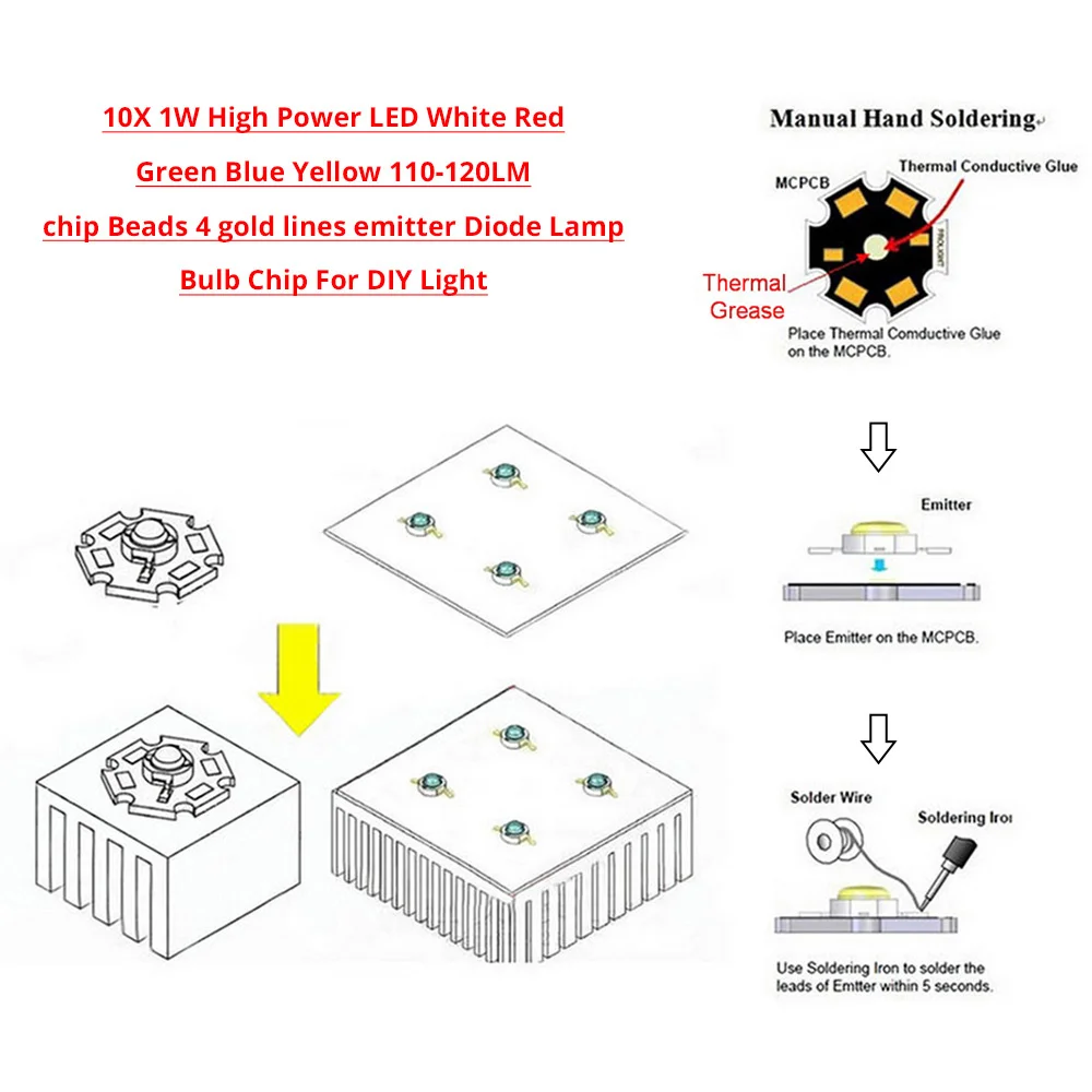 Светодиодный чип, 10 шт., 1 Вт, высокомощные лампы 110-120 лм, чип, бусины, линии, излучатель, Диодная лампа, белый, красный, зеленый, синий, желтый, светодиодный светильник для самостоятельной сборки