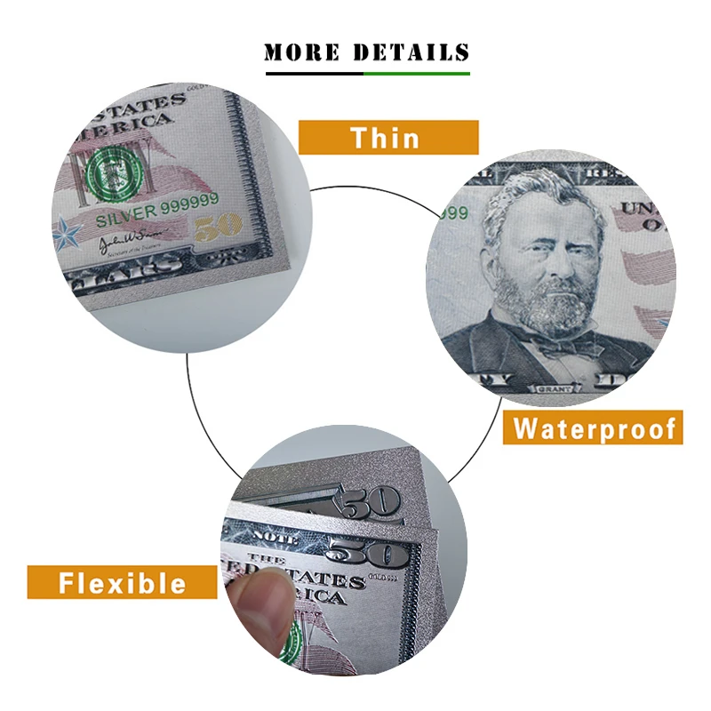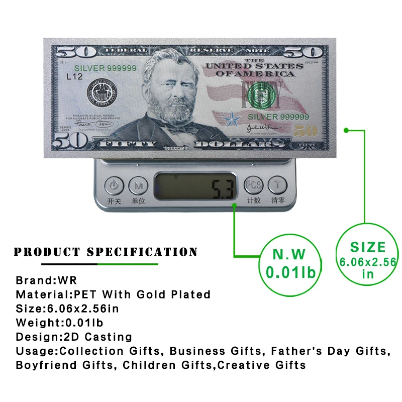 Спецификация:Материал:Пластиковая картаЦвет: ЗолотойБанкнота/серебряная банкнотаВес:0,21 унцийРазмер: 5,83*2,91ВCh