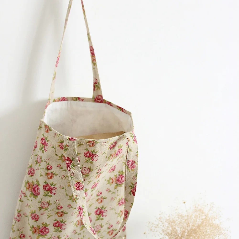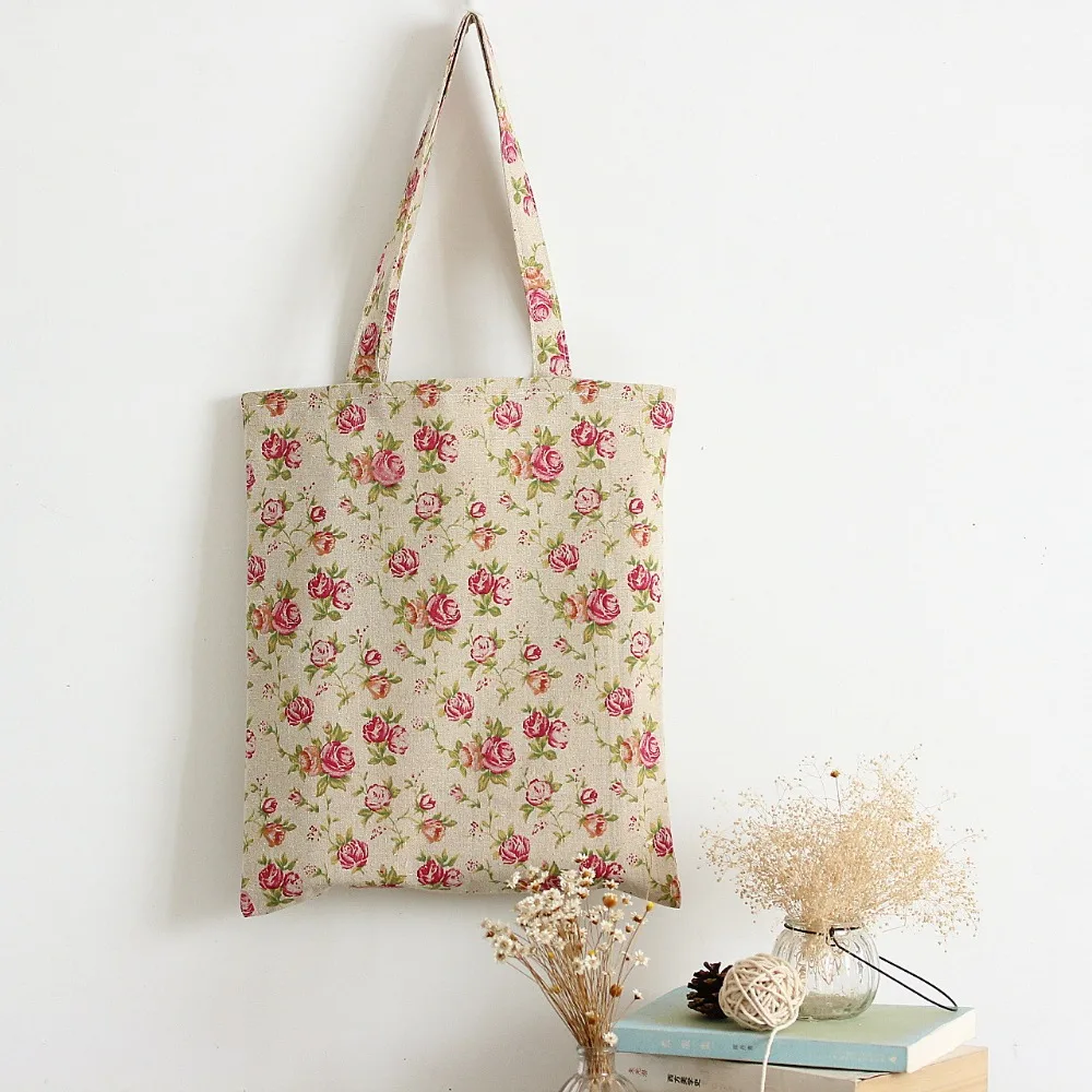 YILE вручную Экологически чистая многоразовая сумка-шоппер через плечо из хлопка и льна, сумка-тоут с цветком розы L149