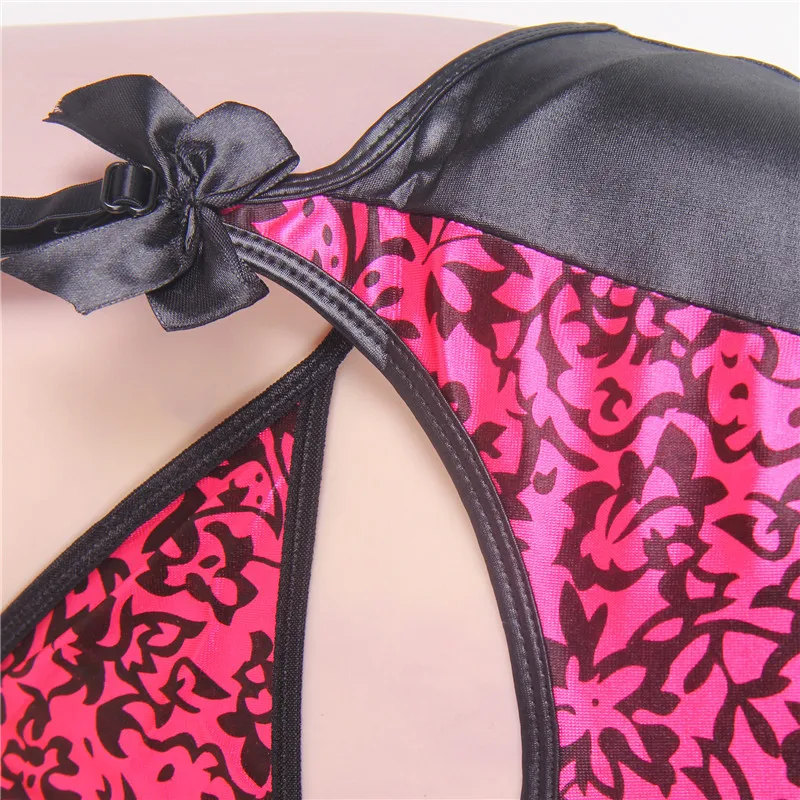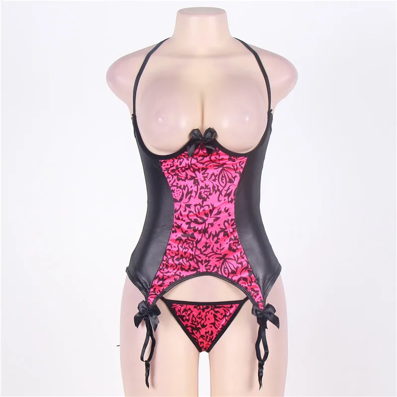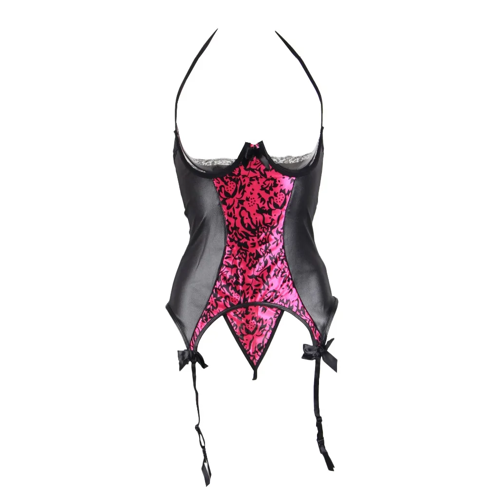 Искусственная кожаная одежда для сна кружевное сексуальное женское белье корсеты и бюстье с бантом размера плюс белье с лямкой на шее с открытой промежностью, женская одежда для сна R70134