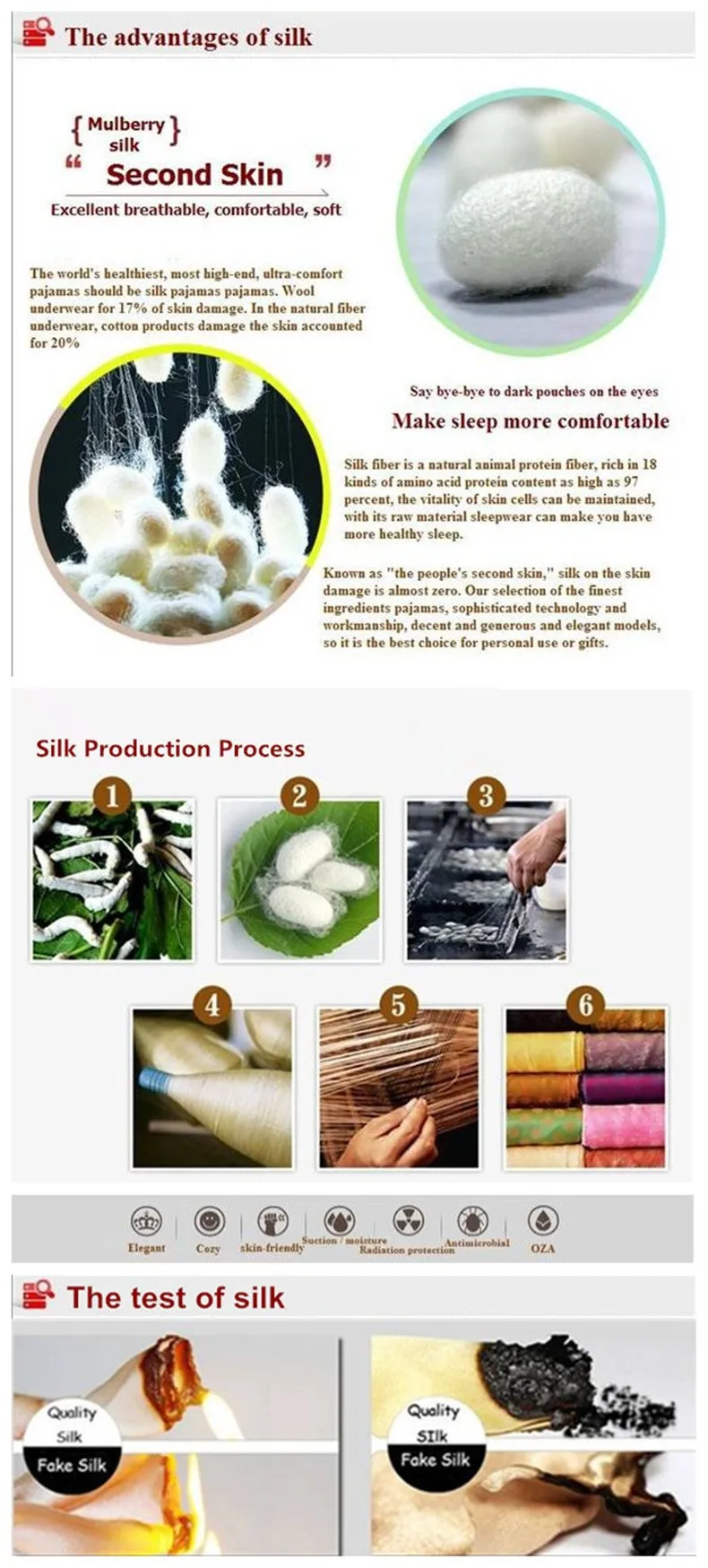 Из настоящей шелковой ткани, изготовленной из шелковой одежды, воздействует на здоровье человека. С древних времен в мире существует шелковая «Королева шелка». В современное время люди давали ему репутацию «здорового волокна», «здорового волокна». Шелковые волокна, необходимые для организма человека, содержат 18 аминокислот, а аминокислоты, содержащиеся в коже человека, почти одинаковы. Итак, есть человеческая репутация "второй кожи".