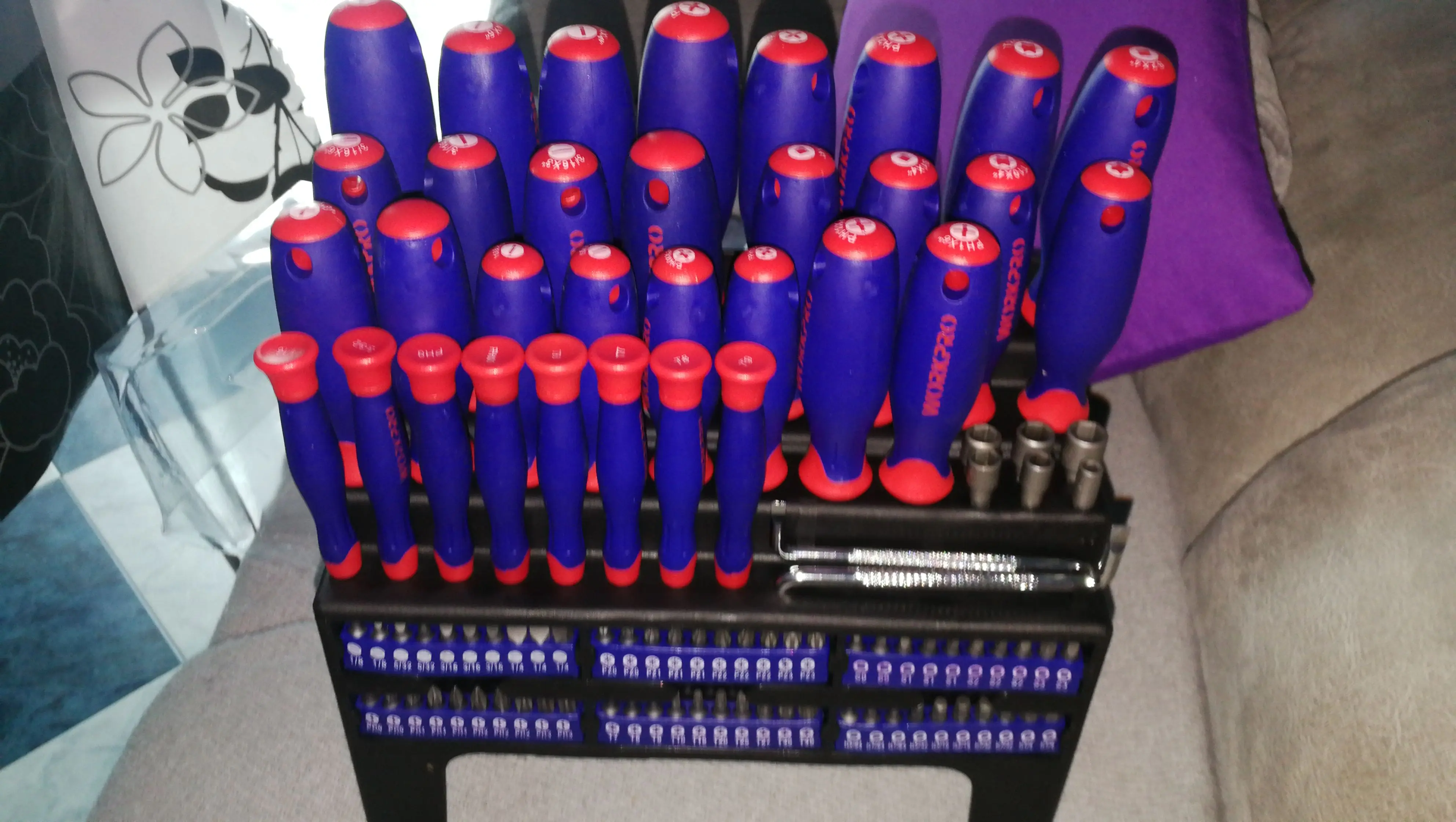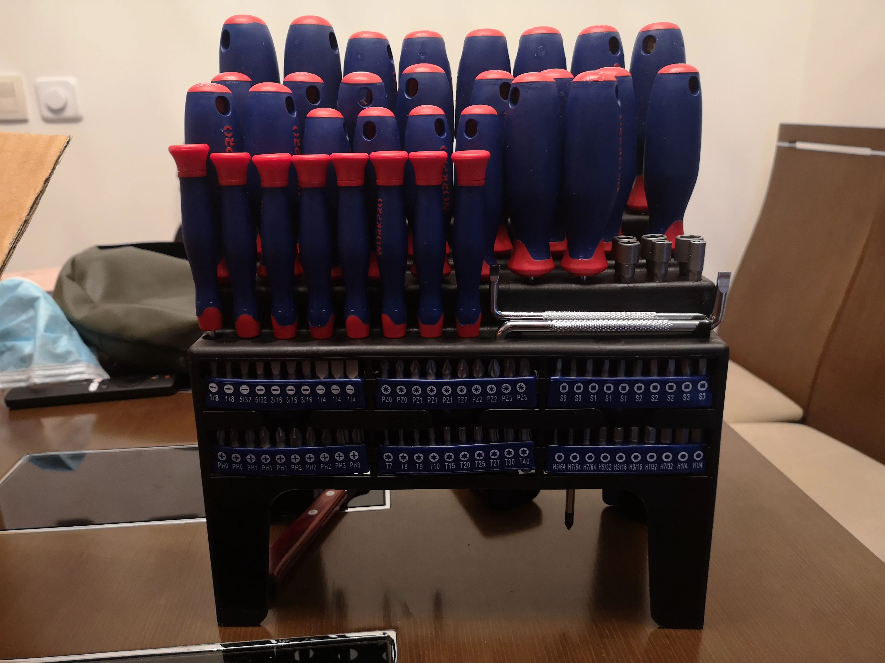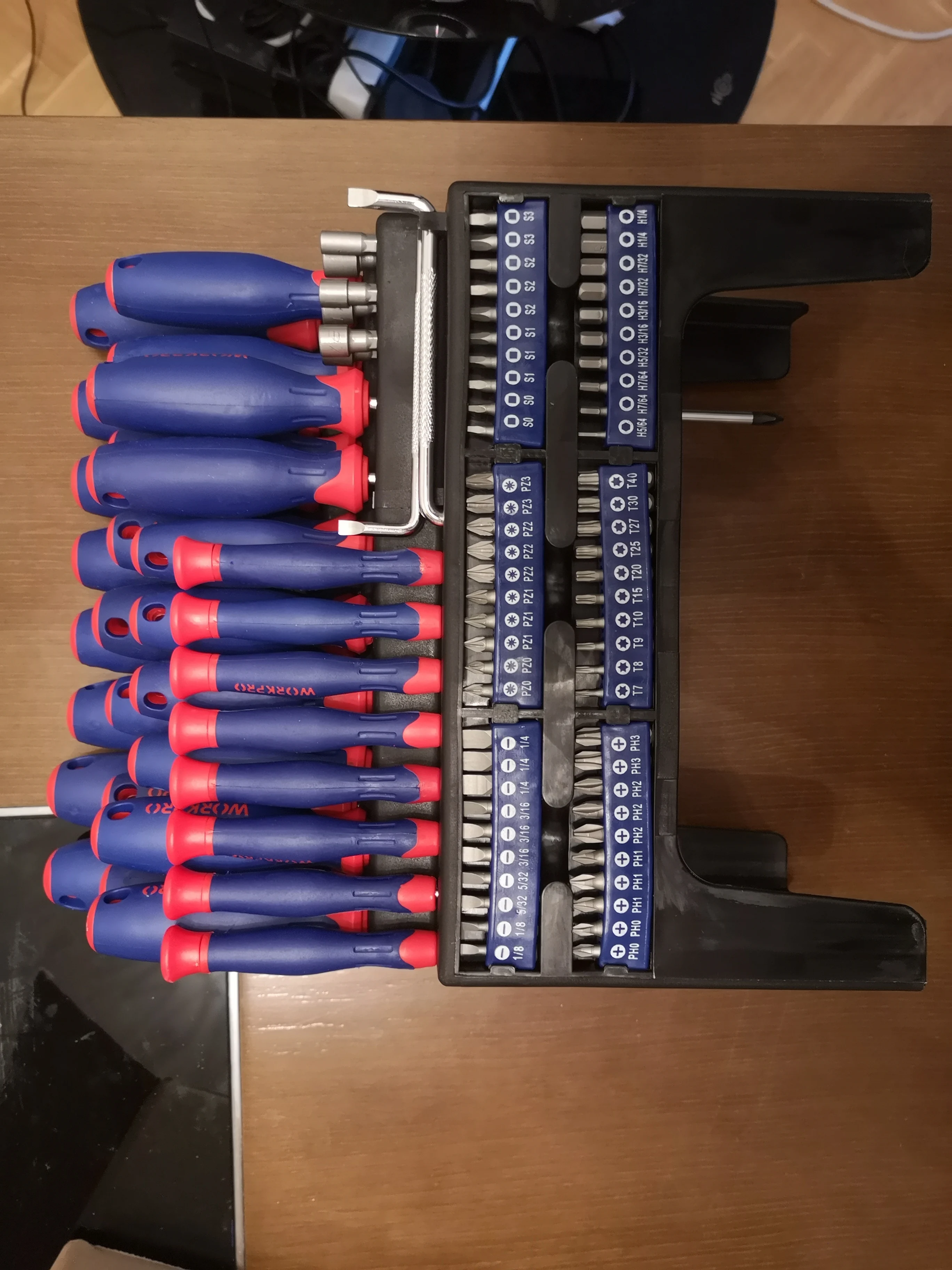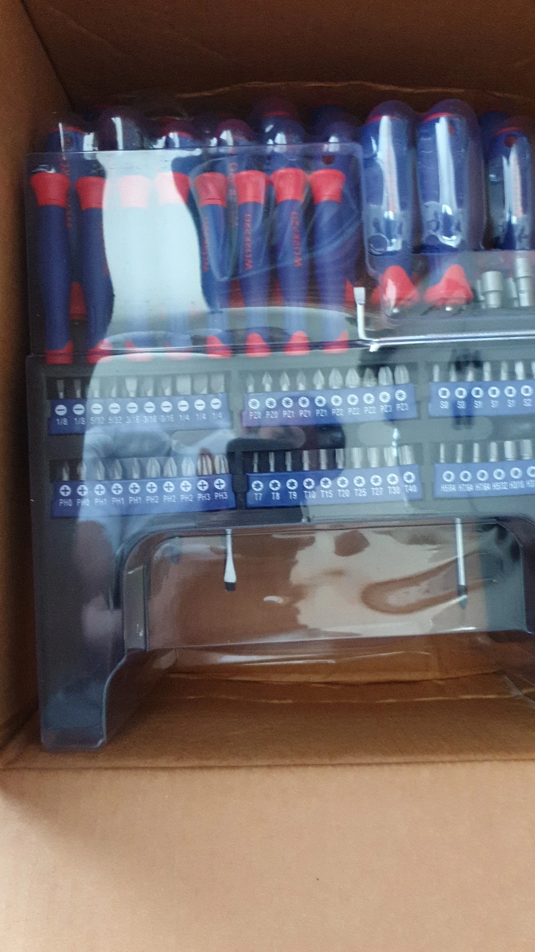 Отличная упаковка. Количество отверток, отличная подставка, чтобы положить на стол, повесить или как вам подходит Советы очень удобны, и ничего не хватает. За 20 евро, не хит! Кроме того, товар прибыл менее чем за 2 недели!