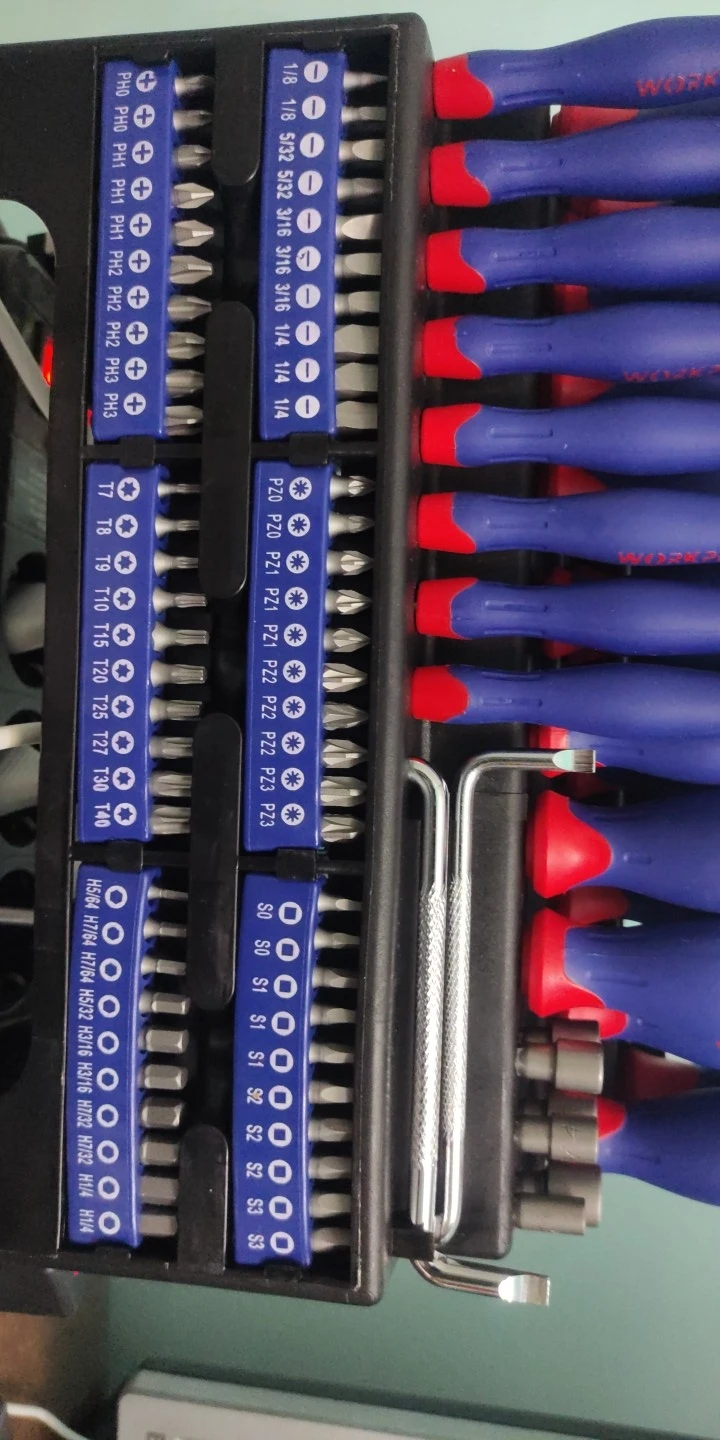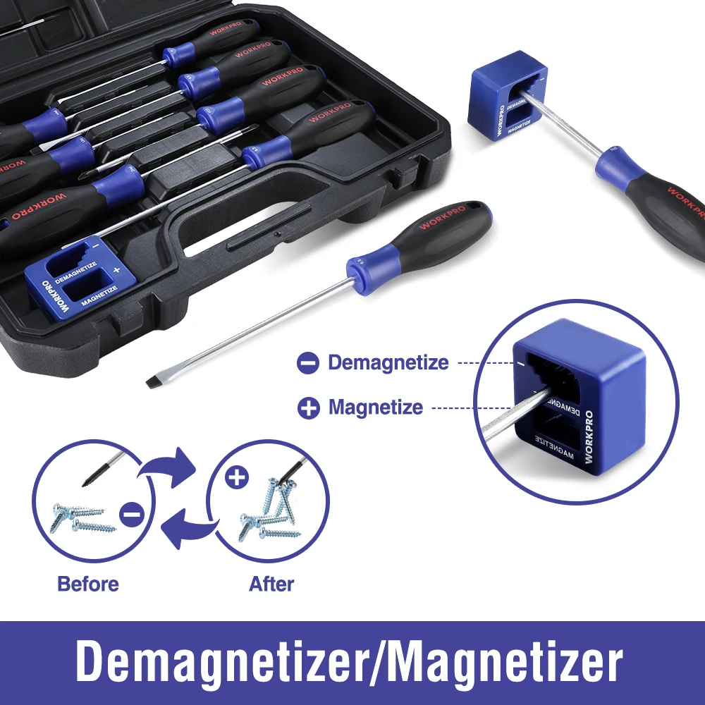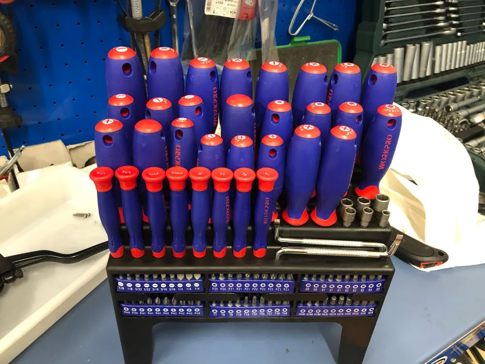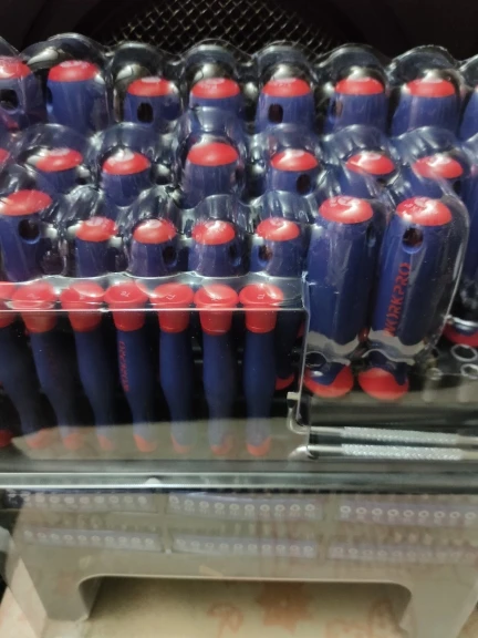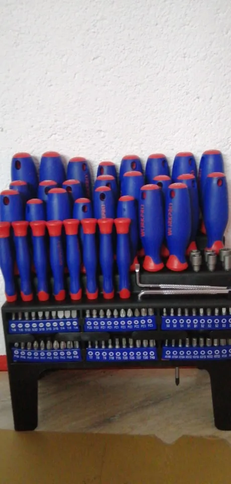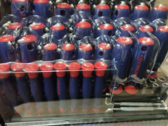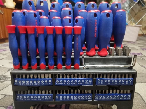 Это мой первый инструмент от WORKPRO.Заказывал 11.11 пришли 21.11. Заказывал из России. Давно мечтал о таком наборе чтобы были под рукой. Есть почти всё самое необходимое. Подставка отличная, можно на столе поставить или повесить на стену. Ручки прорезиренные, в руке лежит удобно и комфортно. Кончик намогниченый. В общем и целом я доволен как слон. Рекомендую продавца.