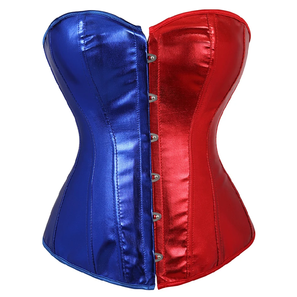 Искусственная кожа корсет Overbust золотоСеребристые танцовщица Клубная одежда готический костюм на молнии на шнуровке с костей карнавал топ, футболка S-2XL