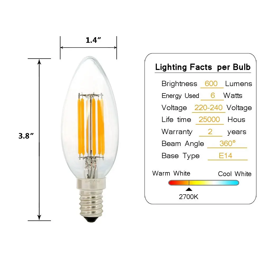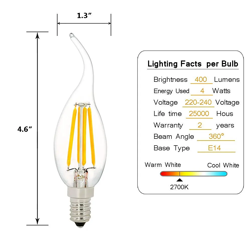Светодиодная лампа-свеча с нитью накаливания C35, 2 Вт, 4 Вт, 6 Вт,...