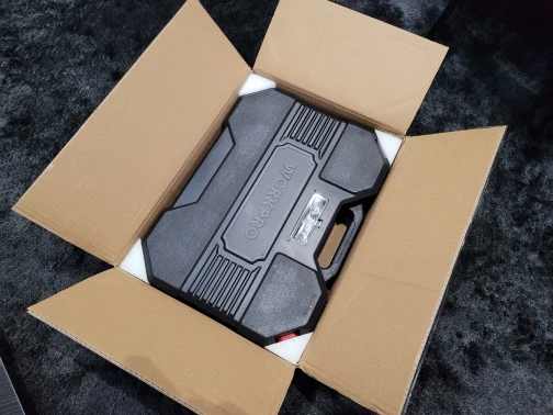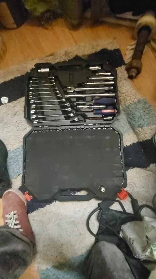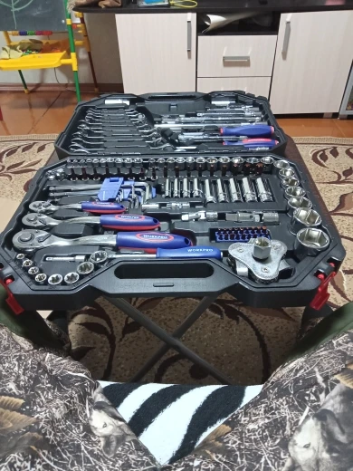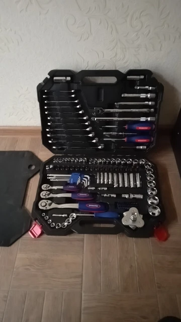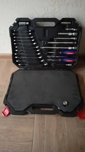Набор пришёл очень быстро через 4 дня курьерской доставкой. Чемодан хорошего качества, даже ручка прорезиненная! Защёлки металлические. Все предметы в наличии, трещётки работают. Головки в работе еще не пробовали, холодно, теперь только до весны, возможно позже дополню отзыв. Но в общем набор понравился, на вид добротный.