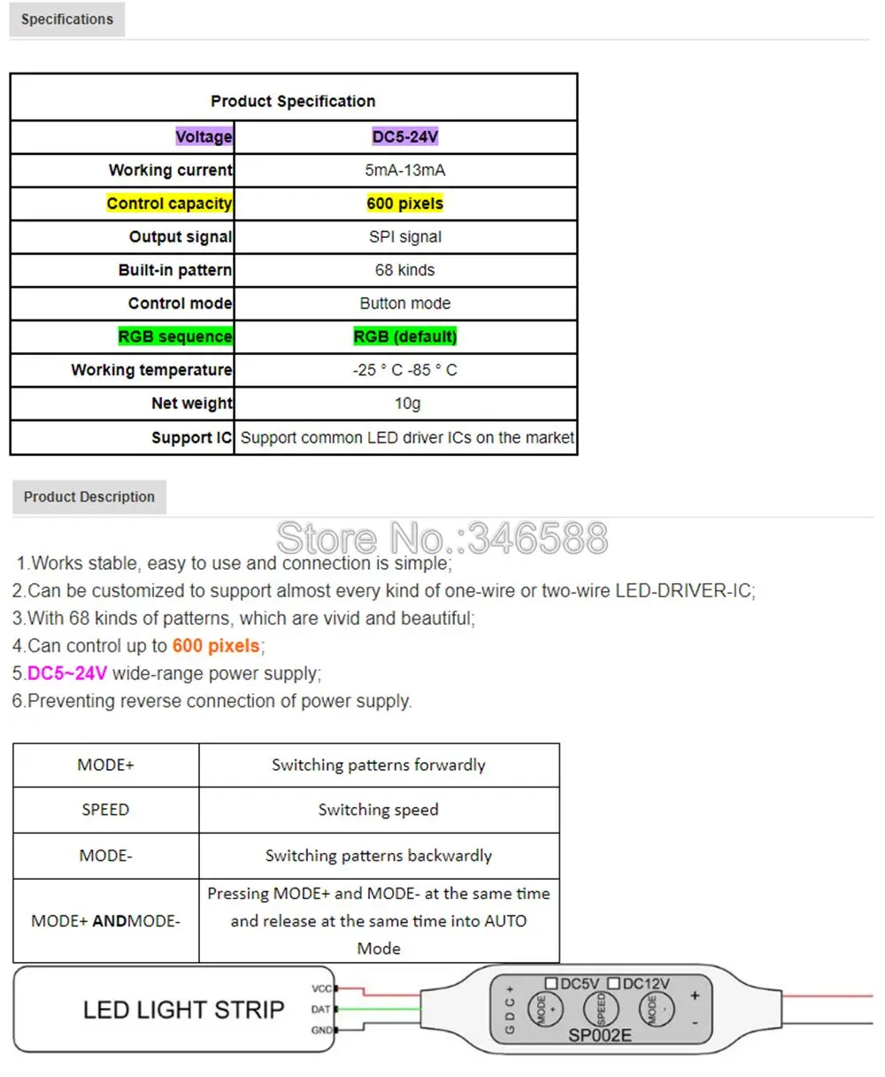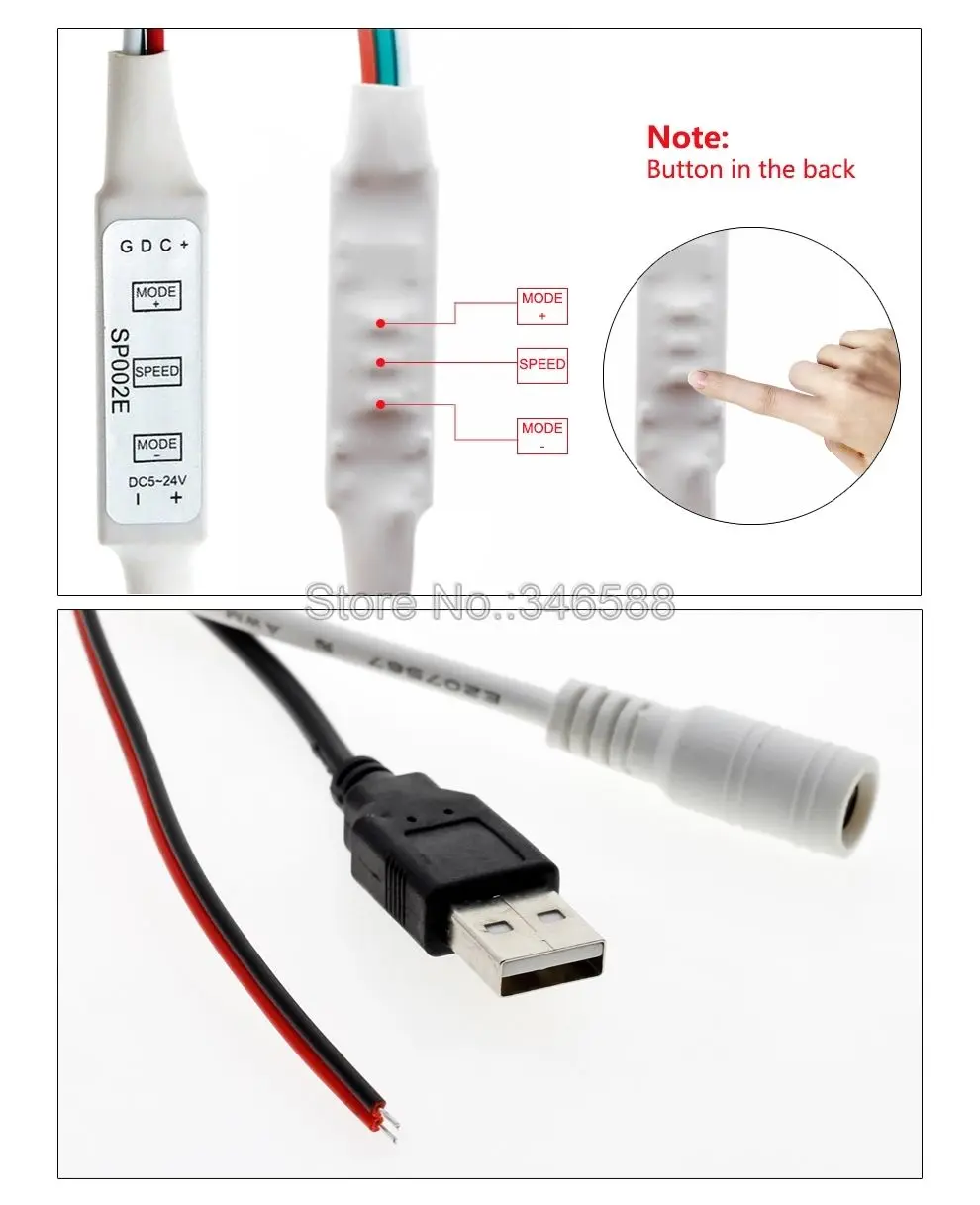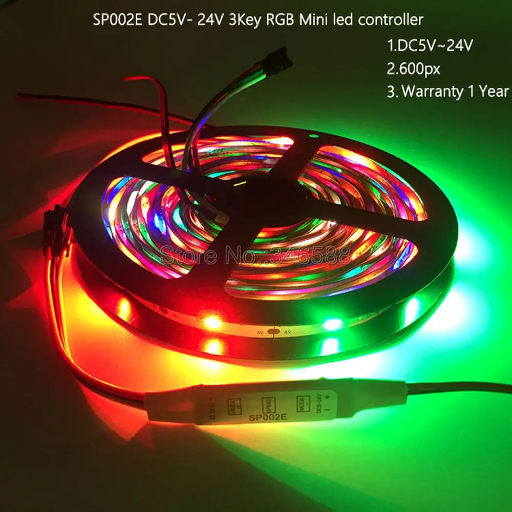 DC5V-24V светодиодный контроллер SP002E, 3-клавишный мини-контроллер для светодиодный кселей, провод, USB интерфейс постоянного тока, 600 пикселей, для светодиодных лент WS2812B, WS2811