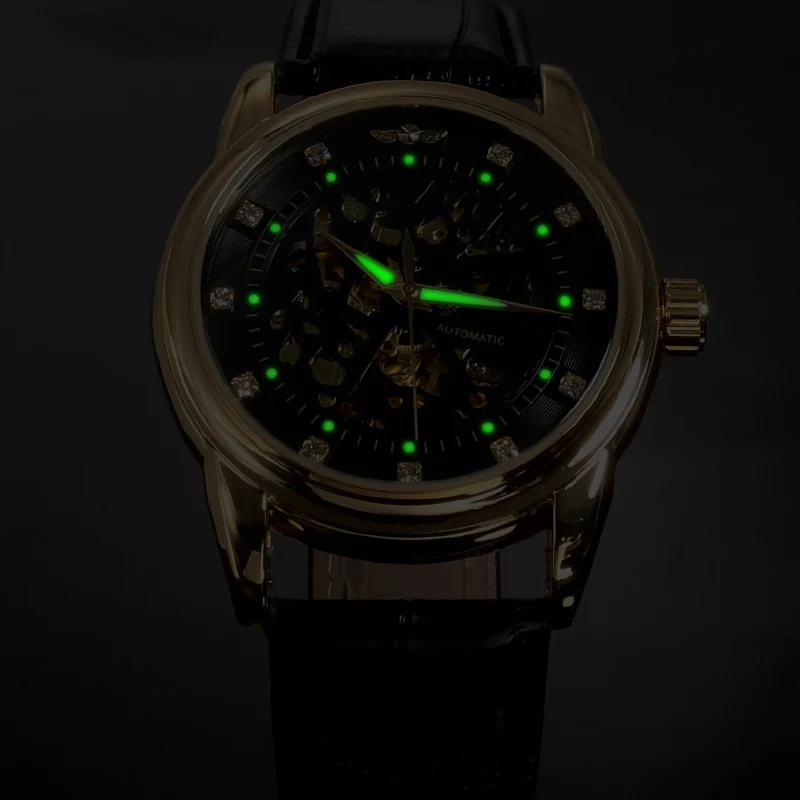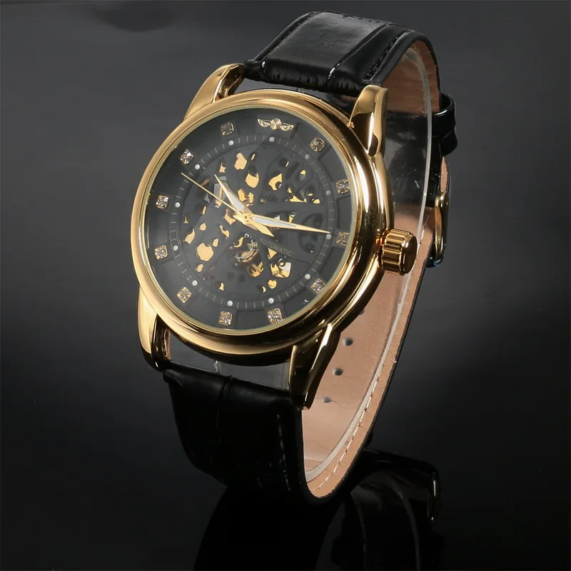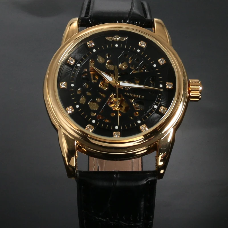 Часы наручные Winner Мужские механические, брендовые роскошные механические часы-скелетоны с королевским бриллиантом, чёрные, золотистые
