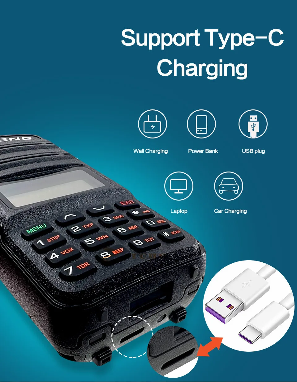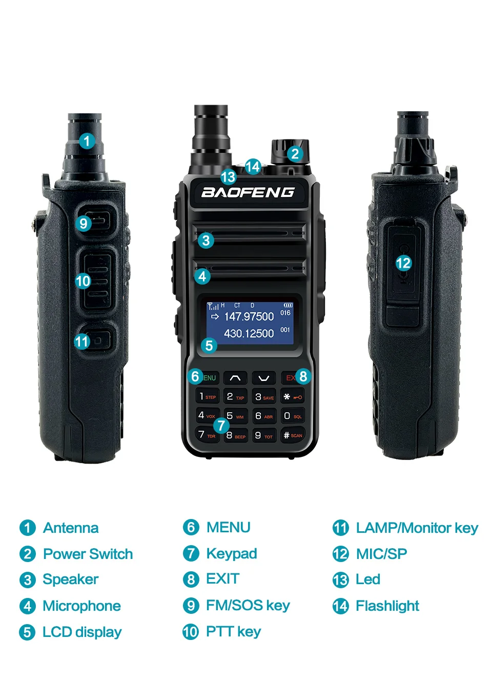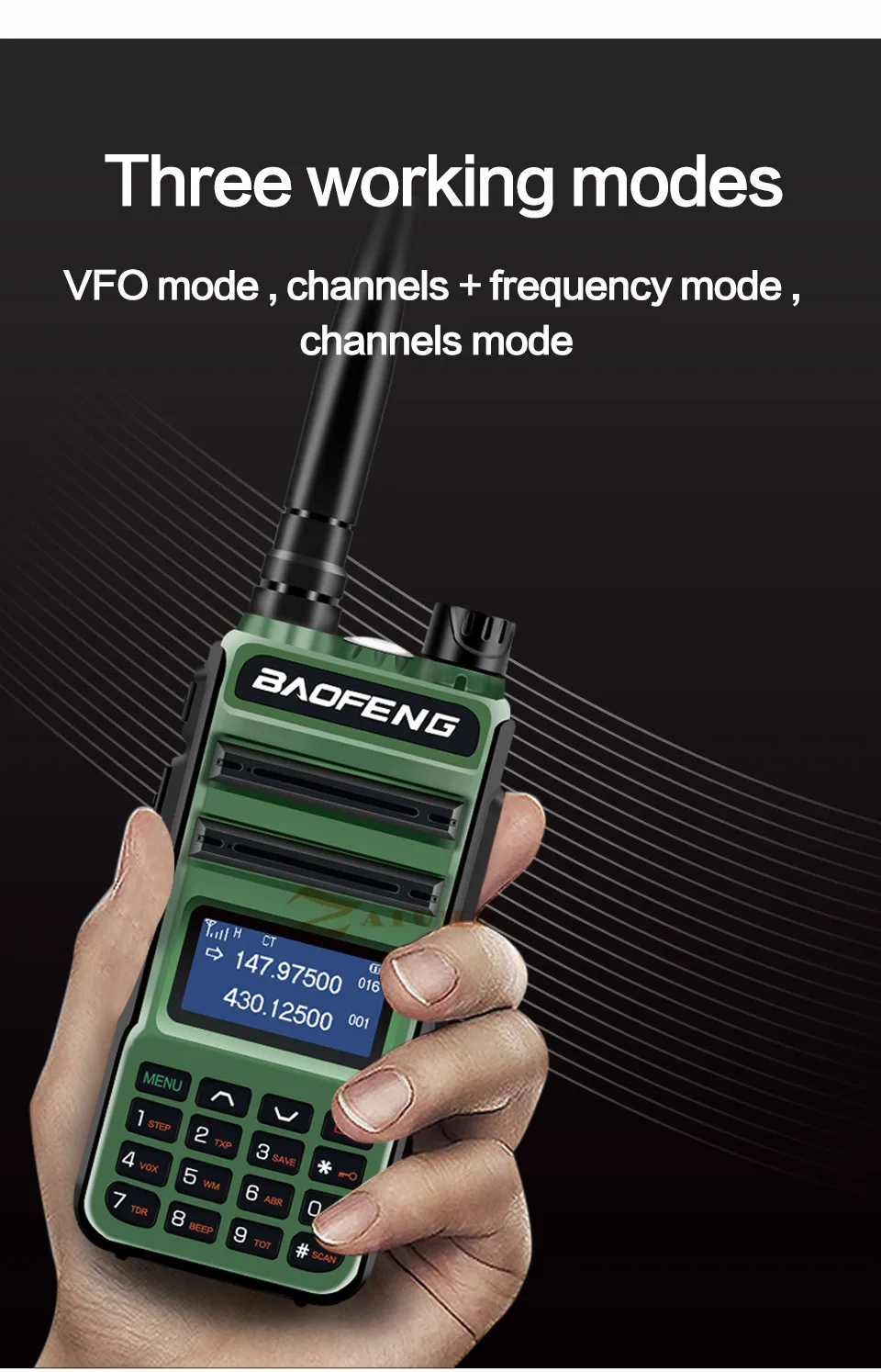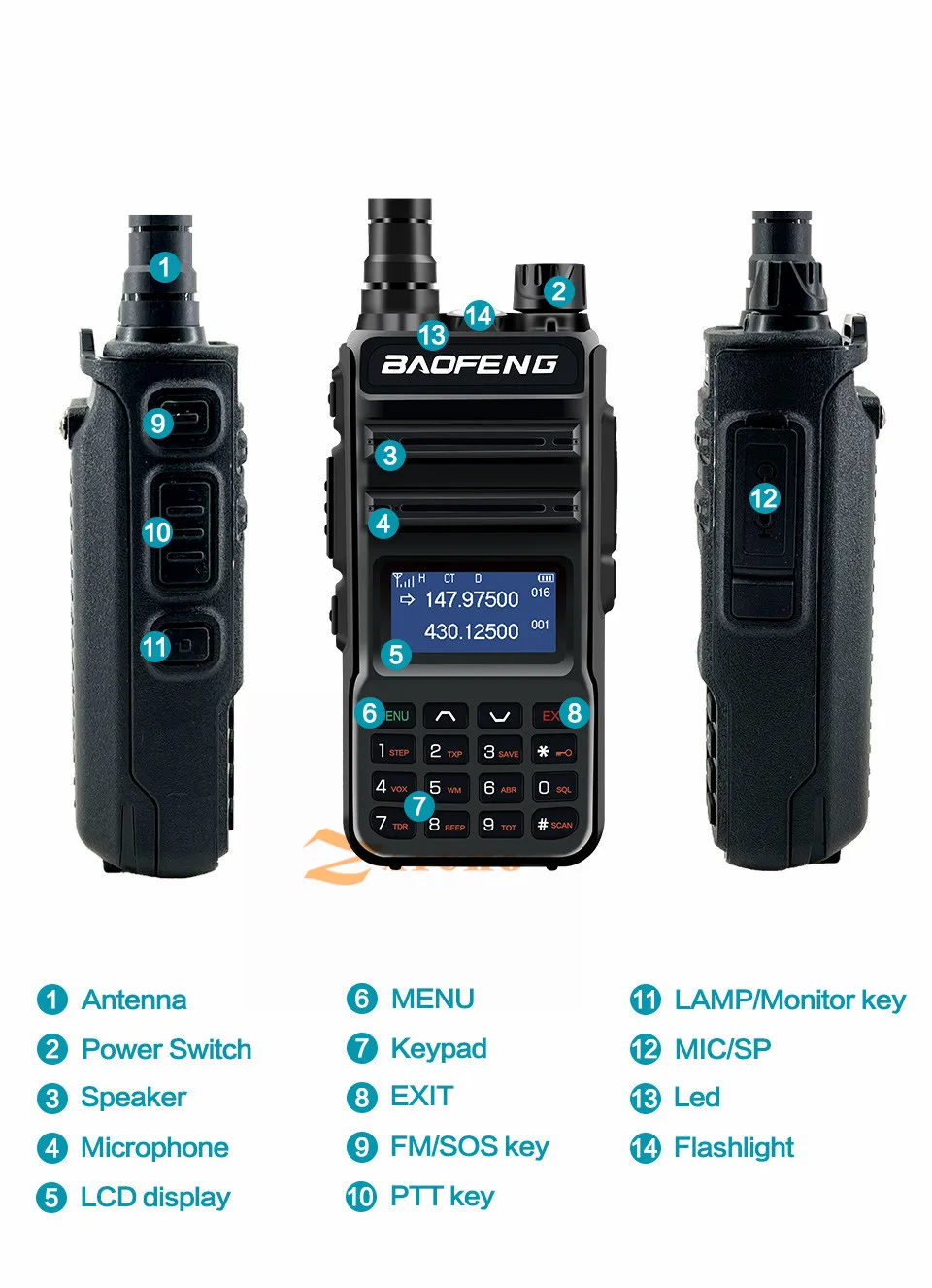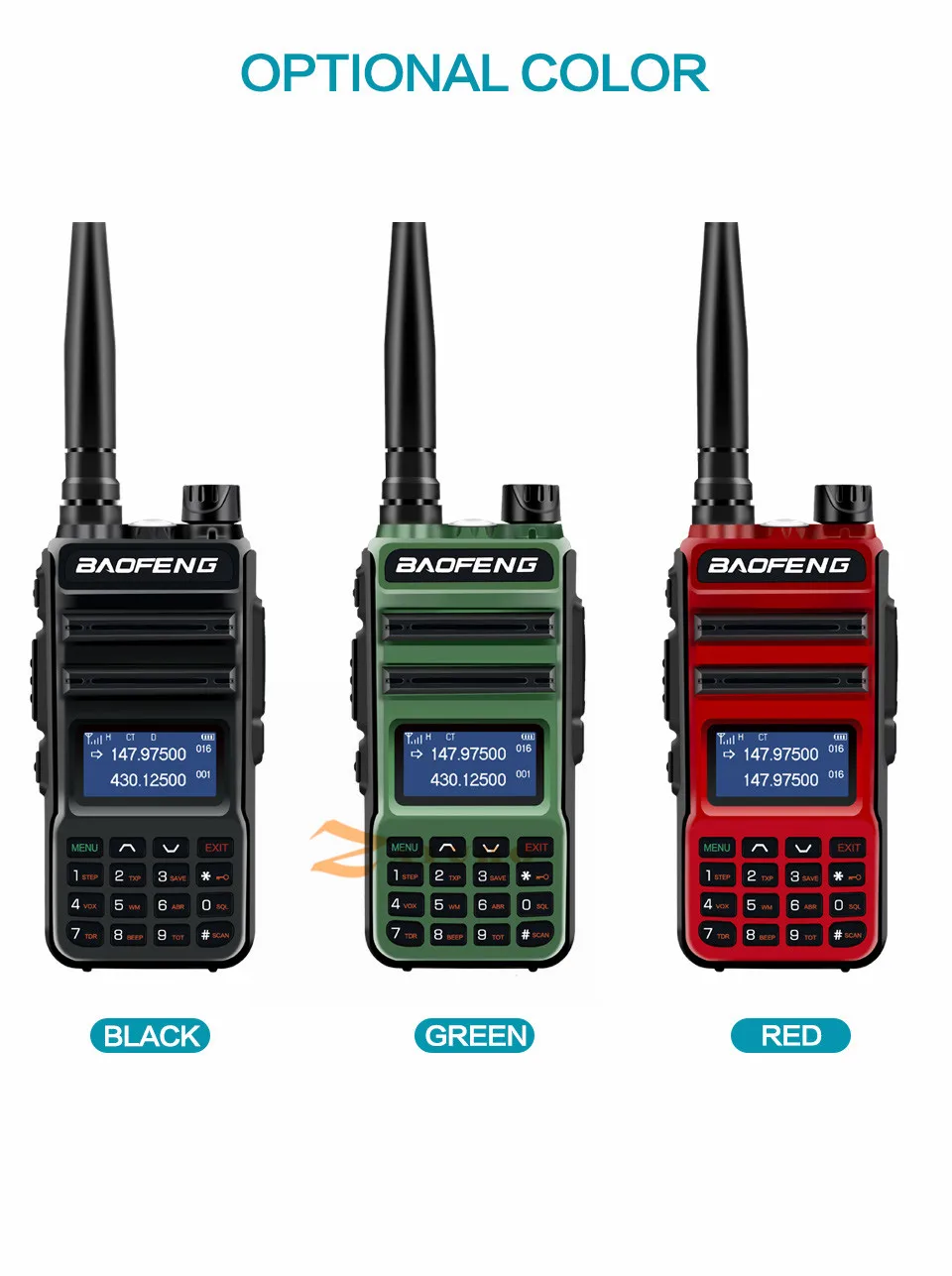 1. Диапазон частот: 136-174/400-520 МГц2. Двухчастотный дисплей, двойная частота. Дисплей, двойной режим ожидания3. Выходная мощность: высокая/более высокая мощность4. 128 каналов 50 CTCSS и 104 DCS5. Встроенная функция VOX6. Ржавчина 1750 Гц7. Fm-трансляция (65,0 МГц-108,0 МГц)8. Светодиодный фонарик9. Большой ЖК-экран10. Высокая/низкая мощность rf переключается11. Переключаемая мини fpv-камера со скоростью 25 кГц/12,5 Кгц12. Аварийная сигнализацияОповещение о низком заряде батареи14. Режим энергосбережения15. Таймер таймаута16. Блокировка клавиатурыКонтролируйте канал18. Канал размер шага: 2,5/5/6.25/10/12.5/25 кГц