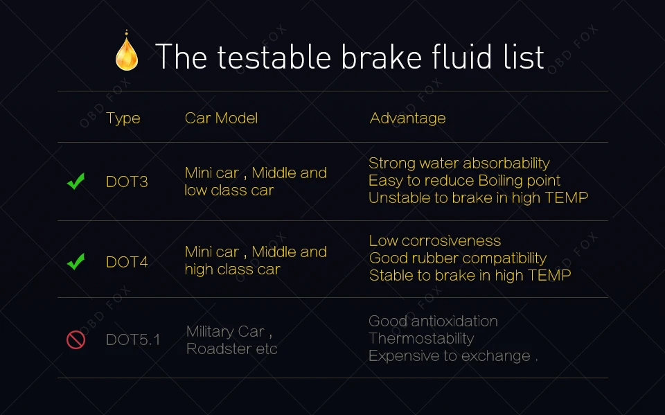 Ручка для обнаружения тормозной жидкости основана на изменении проводимости для определения изменения влажности тормозной жидкости. Он четко показывает степень влаги, содержащейся светильник светоизлучающих диодах, высокое содержание влаги приведет к снижению температуры кипения, что влияет на эффективность торможения.-Красный указывает на необходимость немедленной замены тормозной жидкости.-Зеленый цвет-хорошее состояние.-Желтый цвет указывает на приемлемое состояние, но вскоре заменяется.