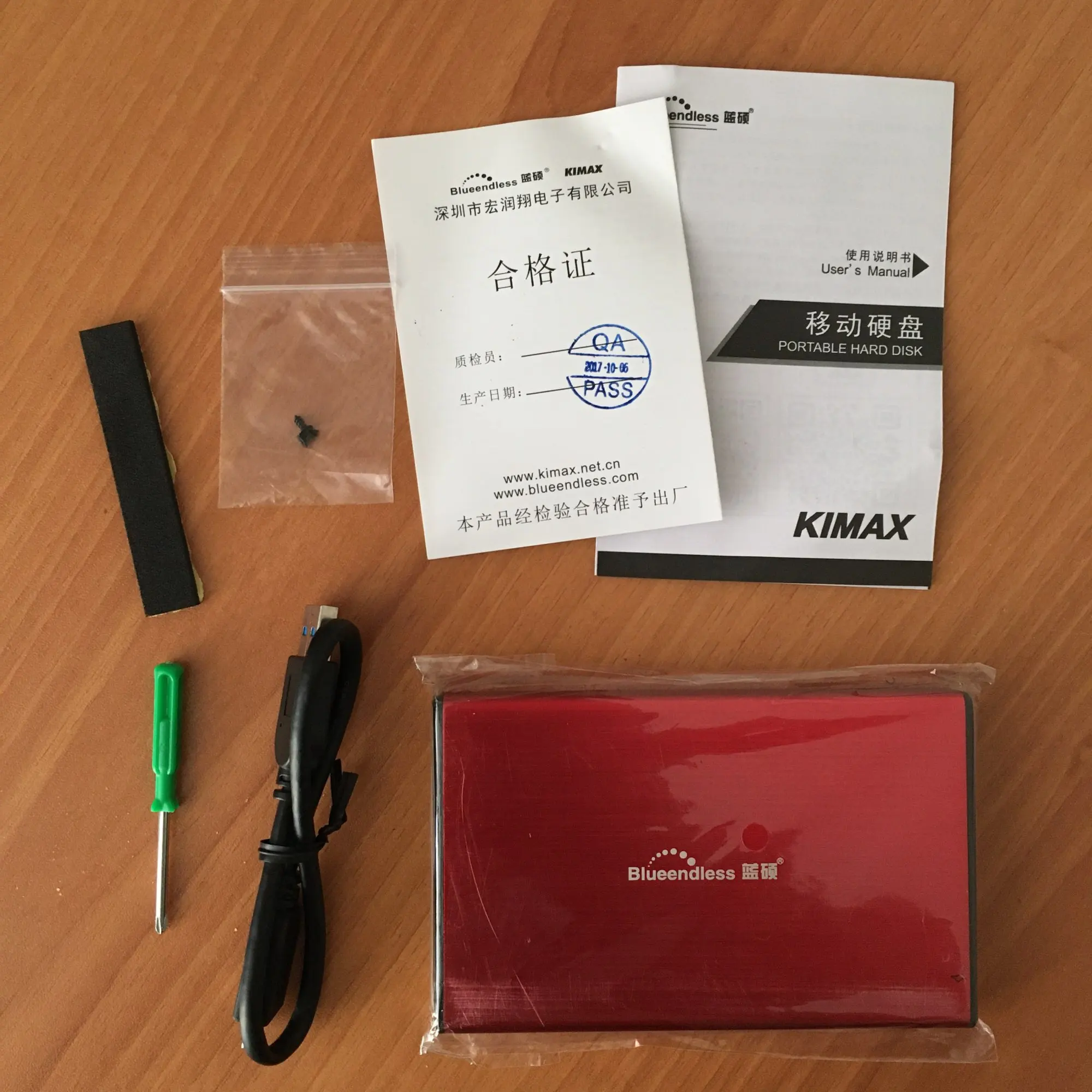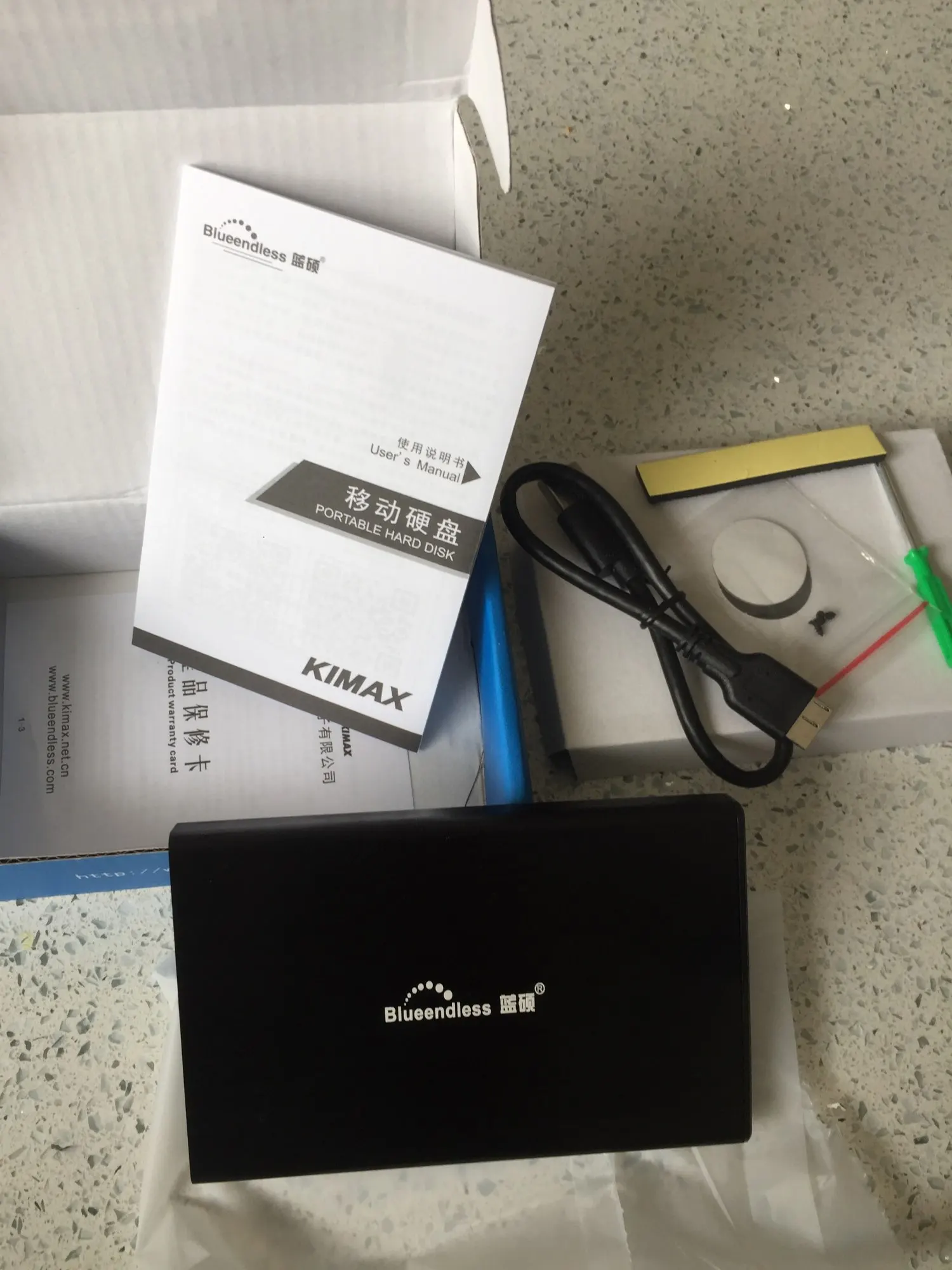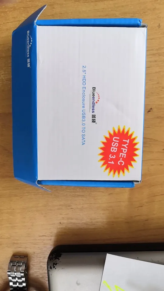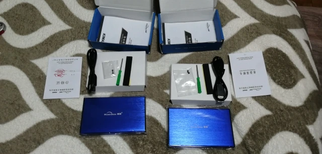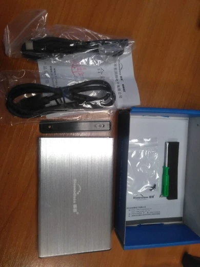 доставка быстрая: меньше недели. упаковано хорошо. в комплекте сам бокс, кабель USB 3.0, задняя крышка, крепеж, отвёртка, самоклеющийся демпфер и инструкция на китайском. диск подцепился без проблем. всё очень понравилось. всё как на картинке.