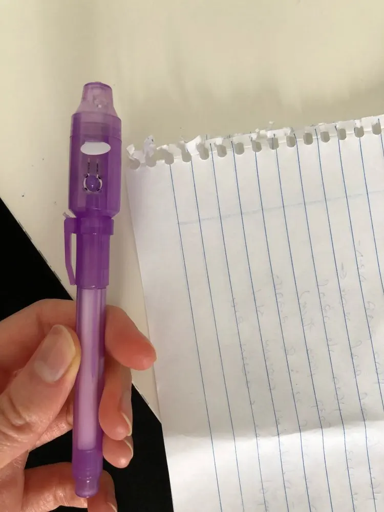 Надписи видны при обычном свете, при свете УФ-фонарика становятся чуть ярче. В общем, ни о какой невидимости речи не идет, разве что на совершенно белом листе бумаги.
