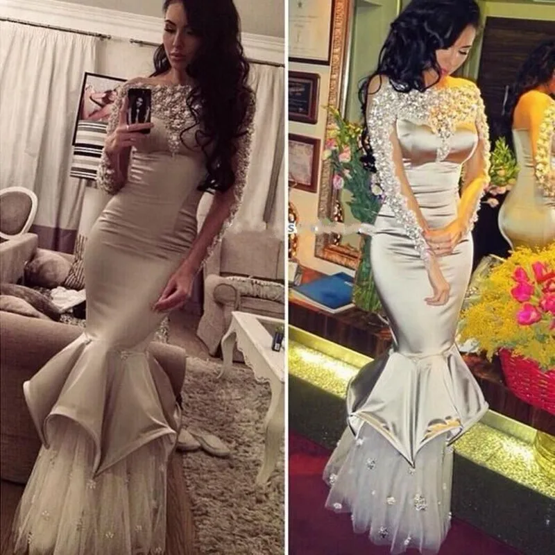 Новый Красота аппликация вечернее платье длиной до пола-Длина с вырезом лодочка со складками вечерние платье из атласа с длинным рукавом бисером Vestidos