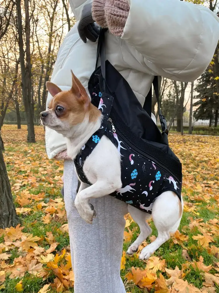 Хороший рюкзачок для моей любимой собачки, длина по спинке у собачки-29 см, окружность груди у собачки 42 см., вес 4 кг. Купили размер L нам просто идеально подошёл. Описание правильное, особенно люблю покупателей которые пишут главное для товара, что бы другой мог легко сорентироваться. и не выставляйте фото свёрнутых посылок, для чего это и не пишите про какой то запах. Самое главное это размеры и качество и фото натурального товара. Будем пробовать носить, качество великолепное, расцветка идеальная, как на сайте. Спасибо продавцу. Дальше будем ждать как всё это устройство понравится моему любимому, ко всему надо привыкать потихоньку.