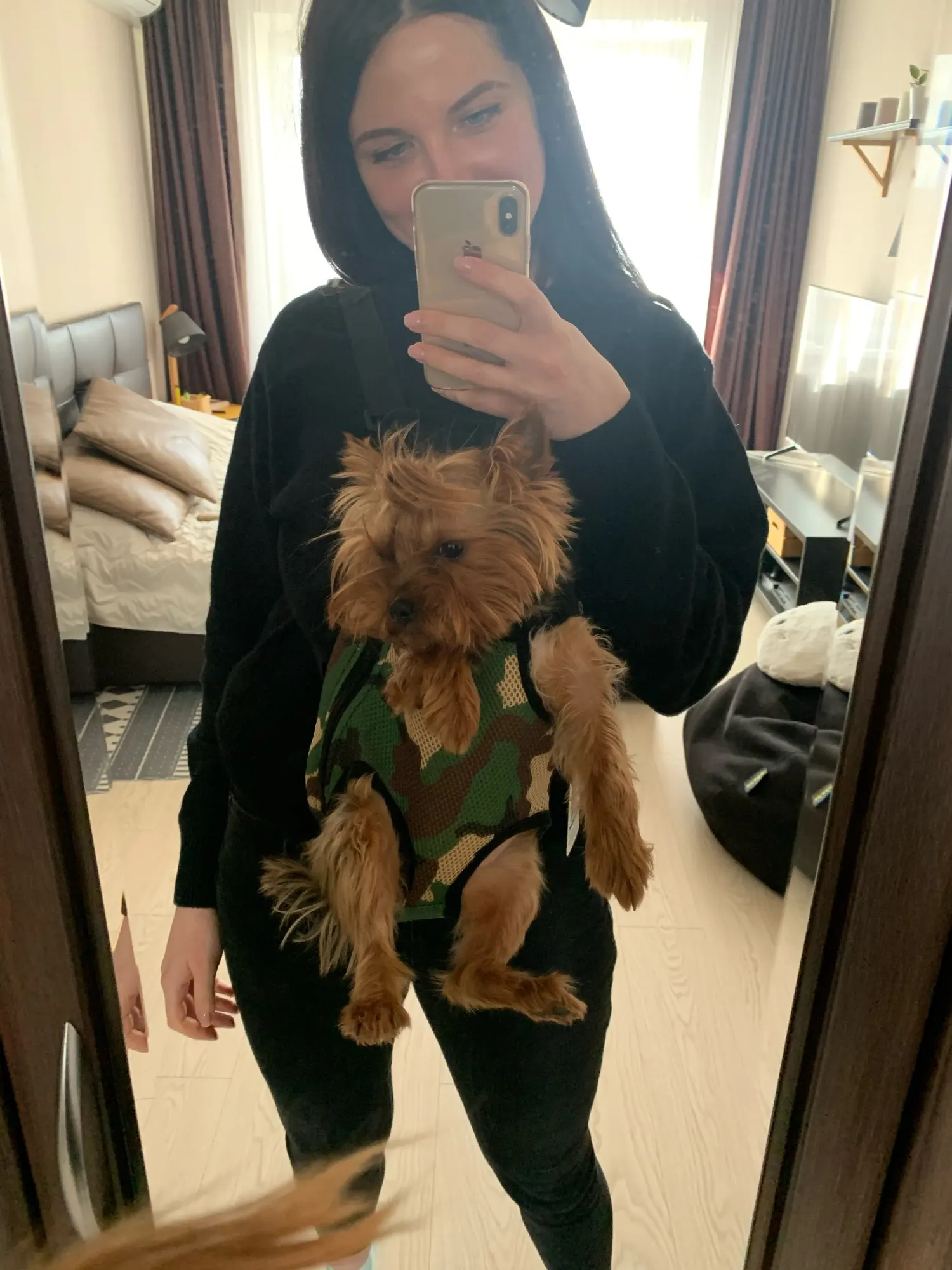 Рекомендую, йорк сидит в слинге спокойн о, не вырывается. Купили для совместных велопрогулок. Вес 2100 размер М идеально.