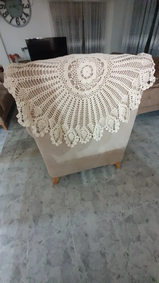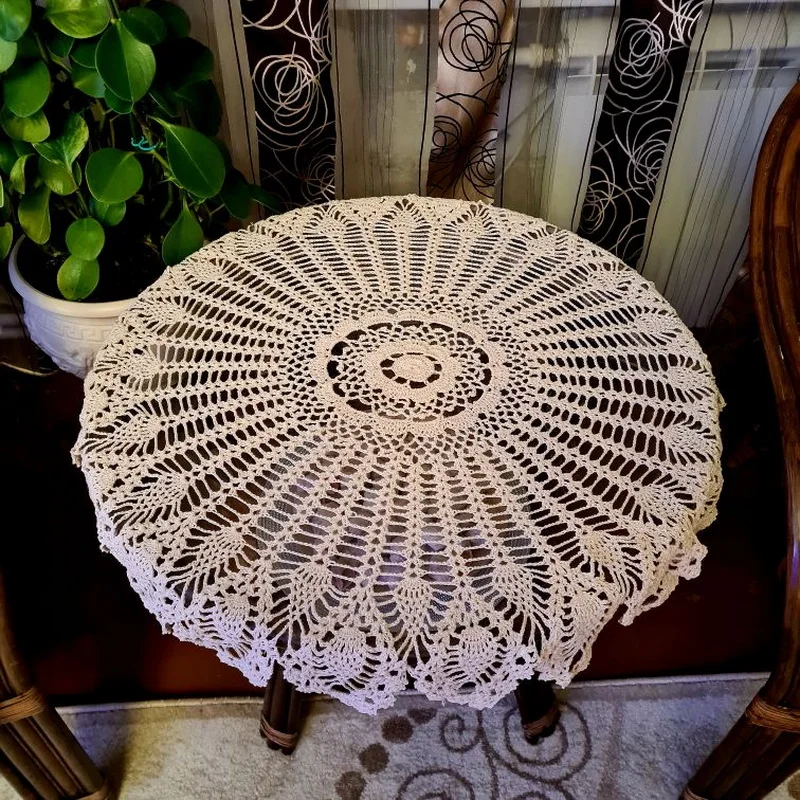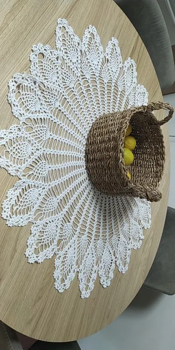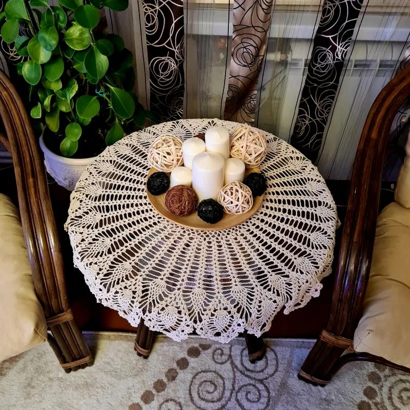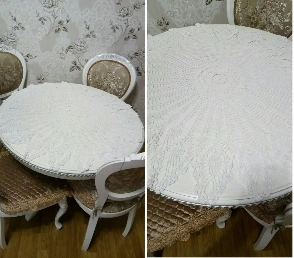 Красивая, точно по размеру стола, продавец положил подарок - начало скатерти, можно довязать самостоятельно