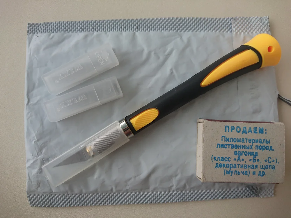 Скальпелем доволен, острый и рукоятка удобная (пластиковая с резиновым чёрным протектором). Зажимной патрон металический с металической резьбой. В комплекте с скальпелем приложено десять лезвий в двух боксах. Заказ дошёл быстр, праздники внесли небольшую задержку. Продавца советую.)))