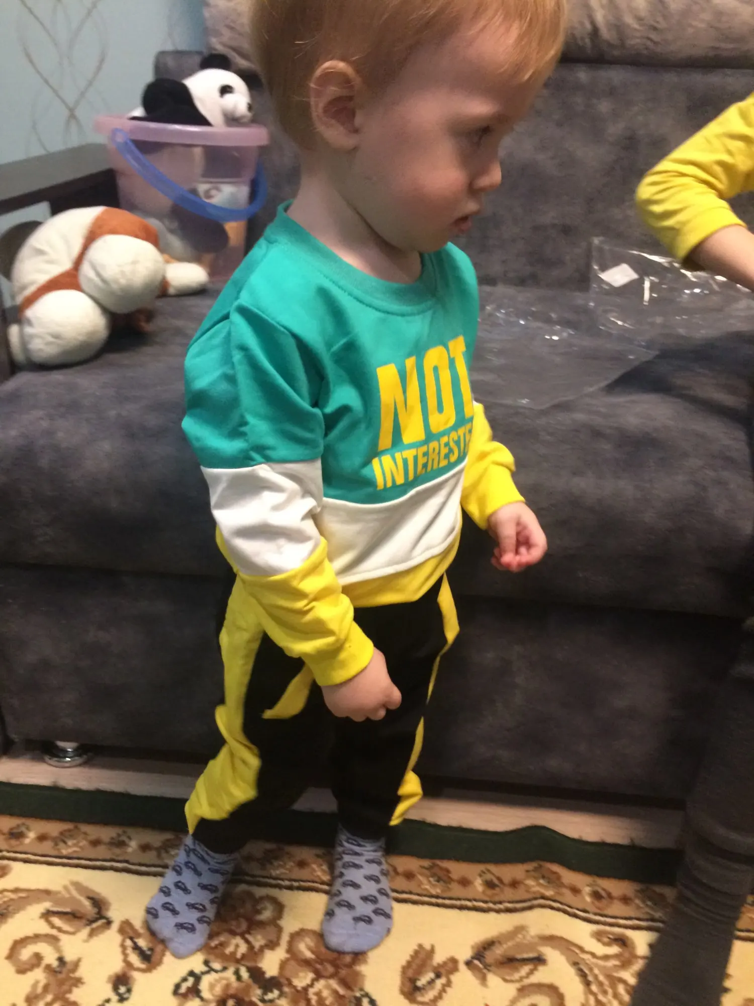 Костюмчик мягкий, яркий, приятный к телу. Для малышей хорошо. На 2 года. рост 90 вес 14-14.5 кг. взяла 24М (100) Идеально подошёл! На штанишках корманы обманка)) Заказала 21 января , получила 18 февраля. Посылка отслеживалась. продавец отправил сразу. Буду заказывать ещё у этого продавца!