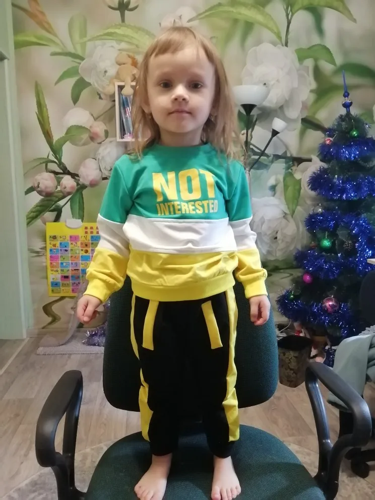 Очень хороший костюм! Впечатление суперское! Выглядит как на фото, штаны так себе расцветка, а кофта вообще бомба, можно под другие штаны одевать, посветлее)) кофта что прям толстовка не скажу, тонкая ткань, но теплее думаю, чем у футболки! Но в целом классный костюм, заказывала на 2 года, пришел 100 размер, порадовало, что штаны не короткие)) думаю поносим его не один сезон, и это радует)) берите, не пожалеете, качество нормальное!