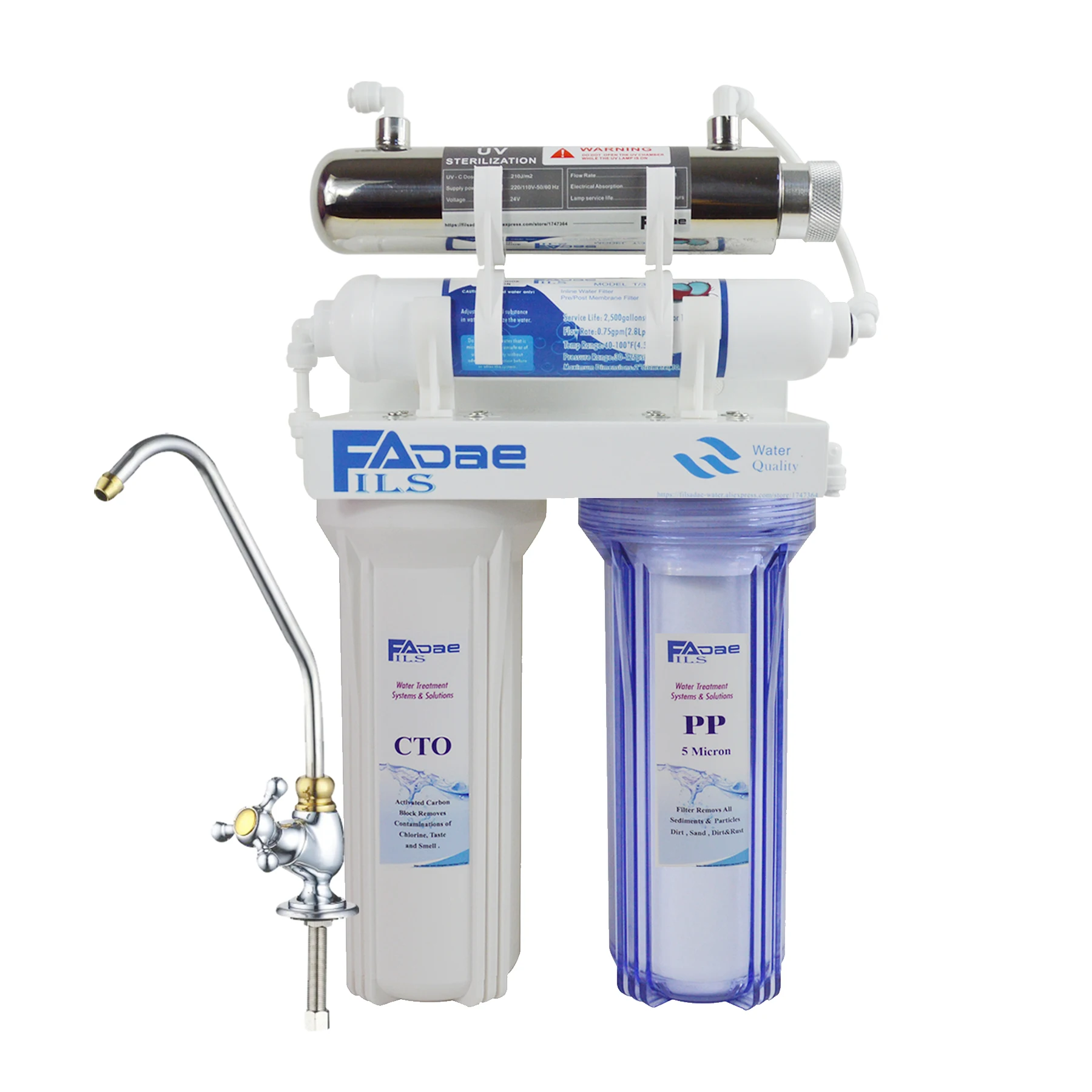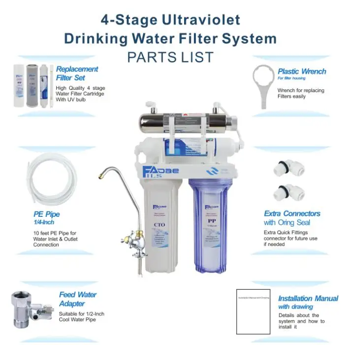 Четырехступенчатая система фильтрации включает в себя все, что можно установить на вашей кухне-система фильтрации под раковиной. -Ультрафиолетовая фильтрация достигается с помощью ультрафиолетовых ламп: вода отправляется через корпус потока; По мере того как вода проходит через УФ-лампу, микробы в воде подвержены воздействию УФ-лучей.