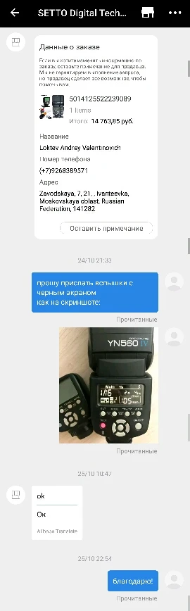 У данного продавца заказываю уже третью вспышку. Заказ пришёл на почту РФ. Вспышки рабочие. Всё ок.