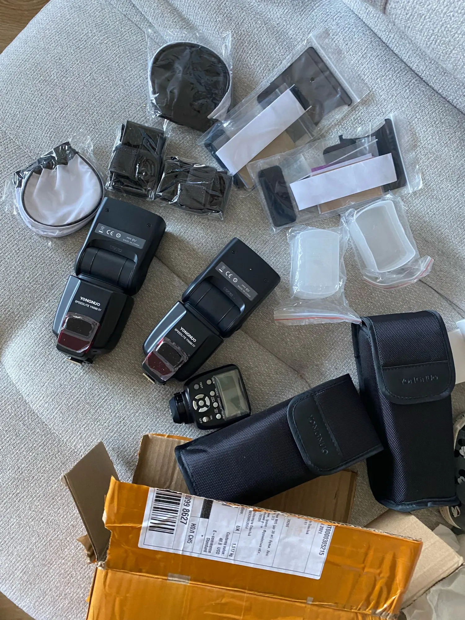 Посылку разделили на 2 части. Первая пришла быстро, вторая через 2 недели. Вспышки хорошие, все работает, трансмиттер тоже работает. В комплекте куча всяких штук: фильтры, соты, рассеиватели. Продавец отвечает оперативно. Но будьте готовы отстегнуть не малый таможенный сбор за покупку свыше 20 тыс.