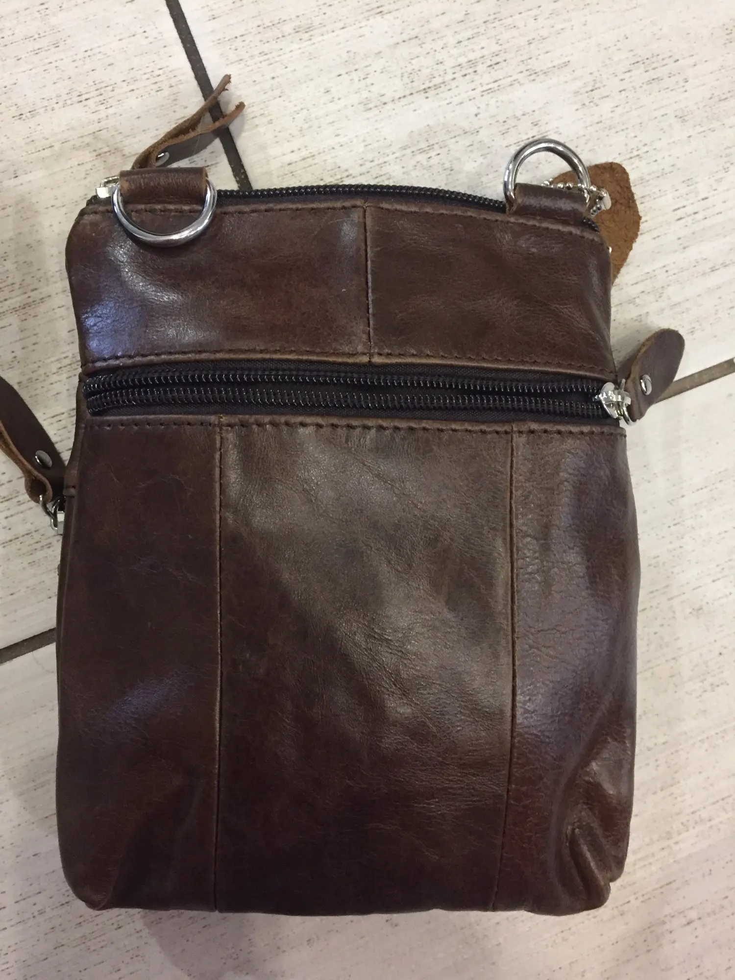 Кожа хорошего качества. Размер сумки ограничен... удобный телефон можно хранить только в основном кармане.