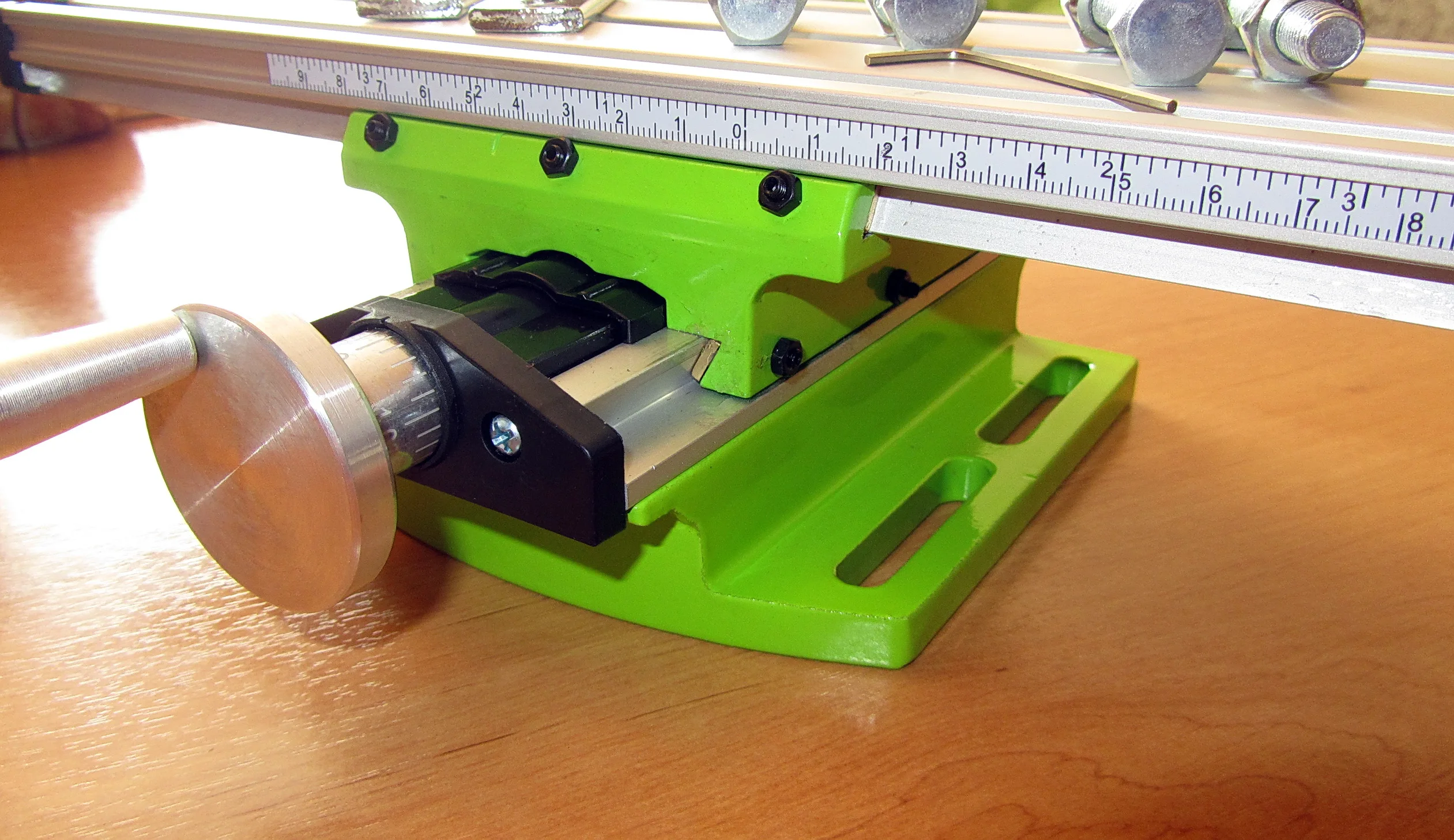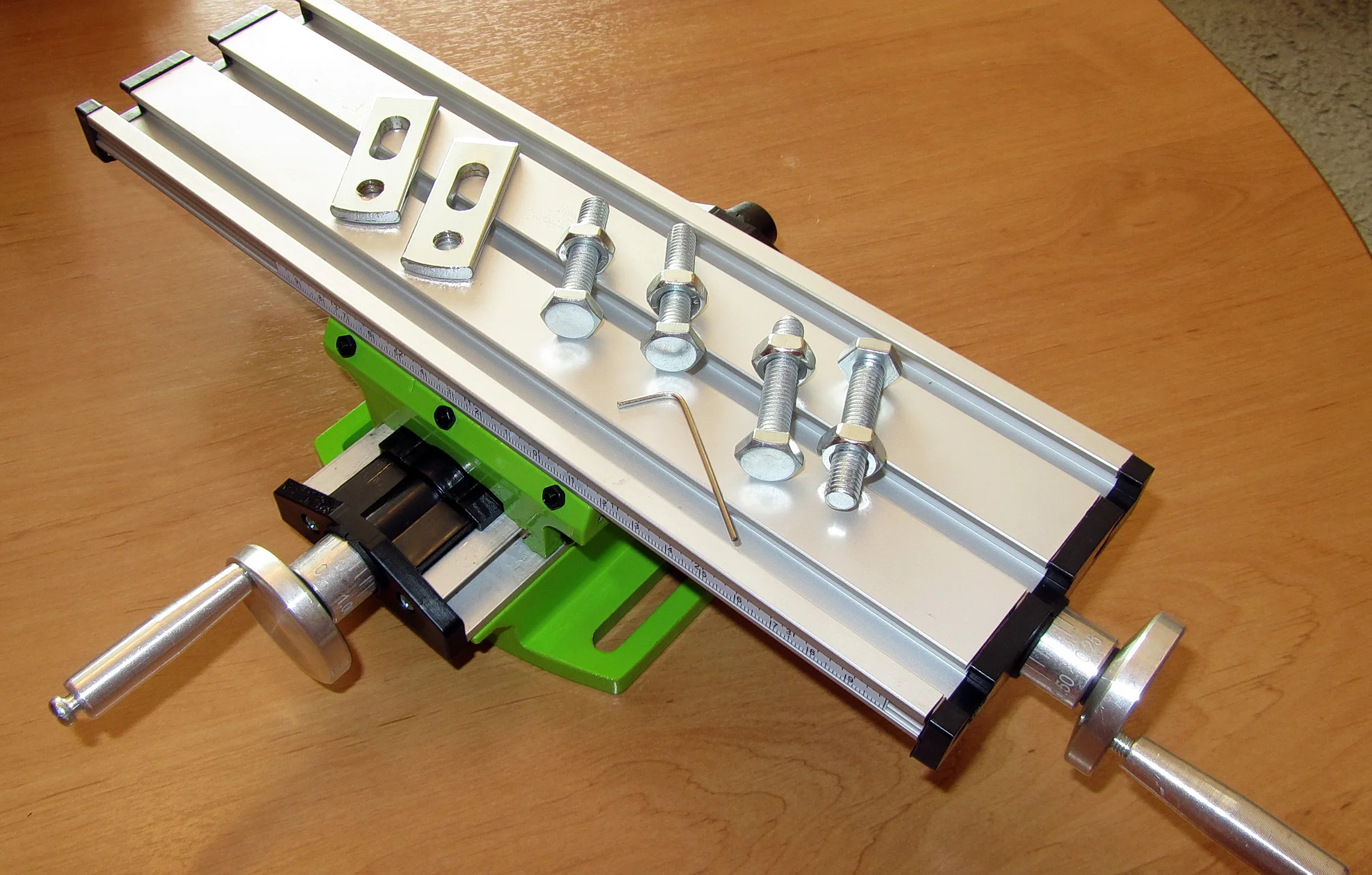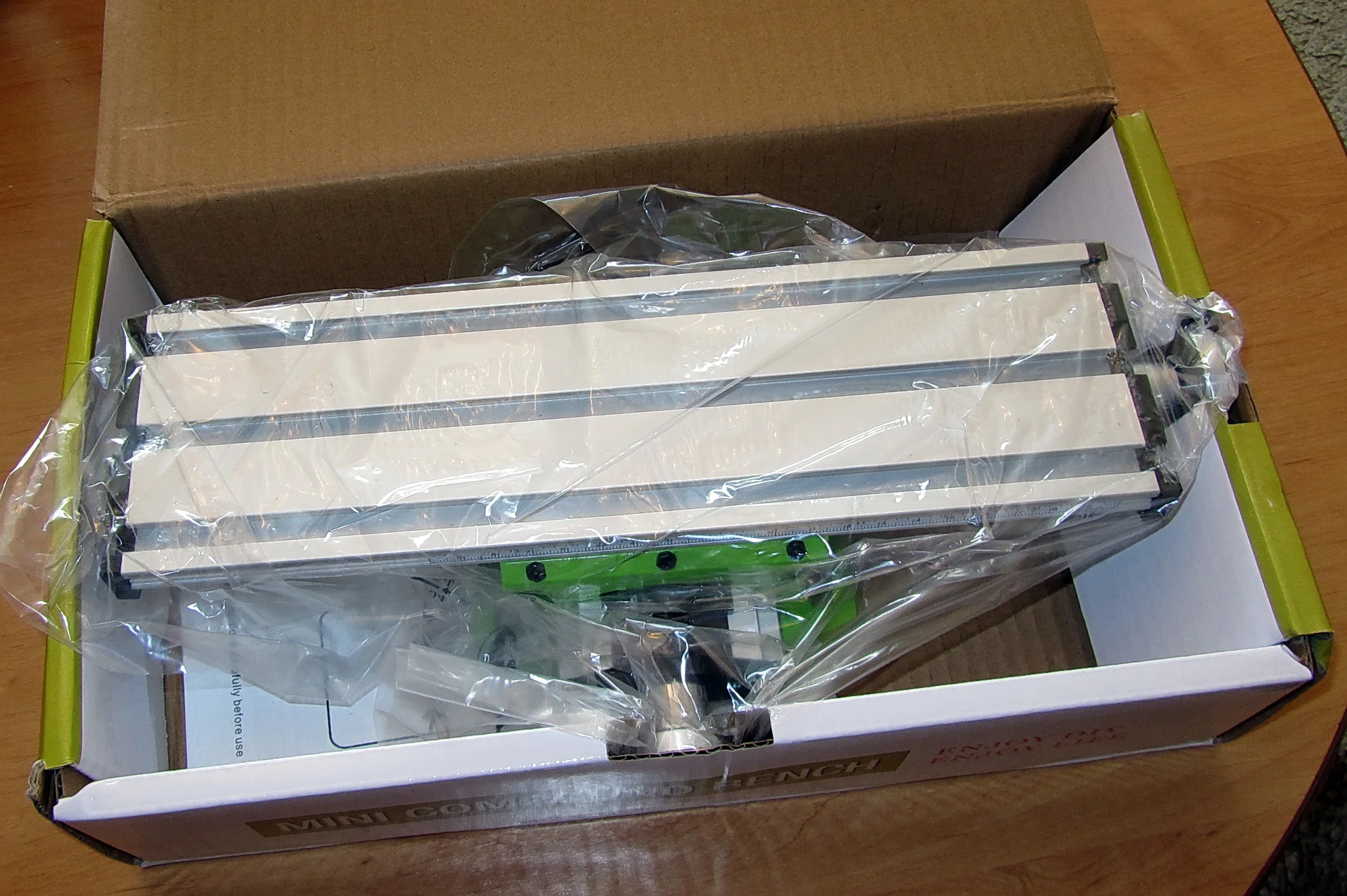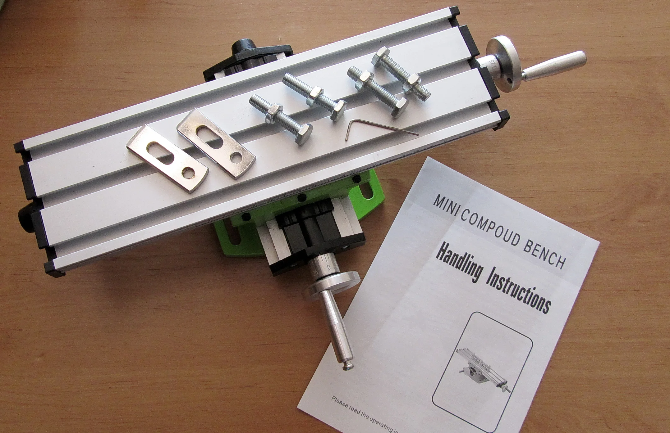 Посылку доставили курьером. Через 10ть дней после заказа. Доставка IML всегда быстро и качественно! Товар в целости. Думал инструмент будет чуть больше в размерах. Выполнен аккуратно. Для небольших работ вполне пригоден. Комплектность соответствует заявленной. Станины скорее всего силуминовые. Рукоятки подач крутятся без заеданий, но ходовые винты всё равно надо смазать дополнительно. Имеется 6-ти гранный ключ для подтяжки направляющих. На станке не показываю. т.к. брал на подарок. Возможно покажу позже. Пока товаром доволен. Продавца рекомендую!