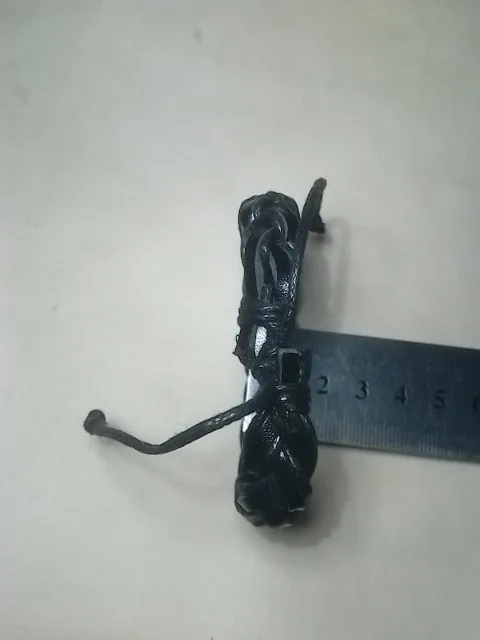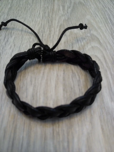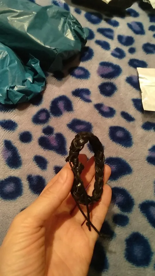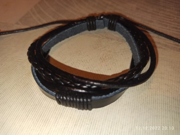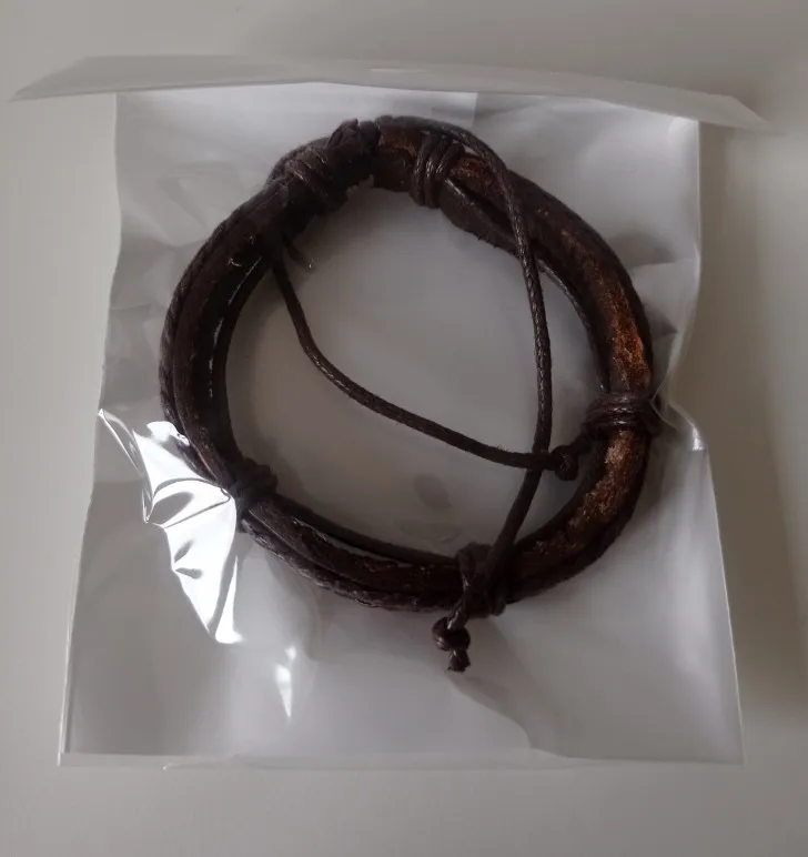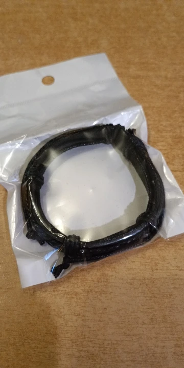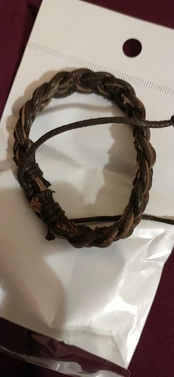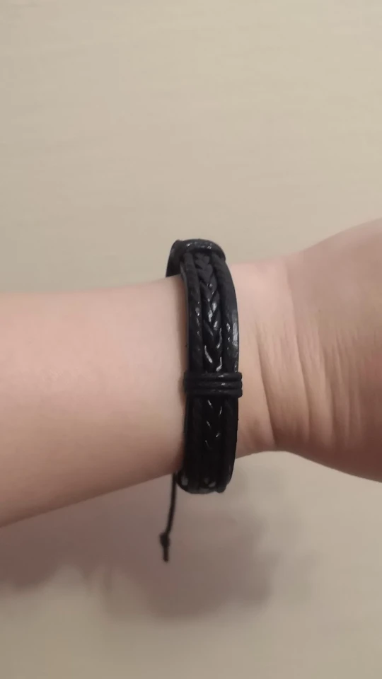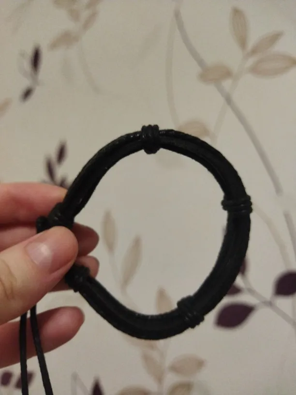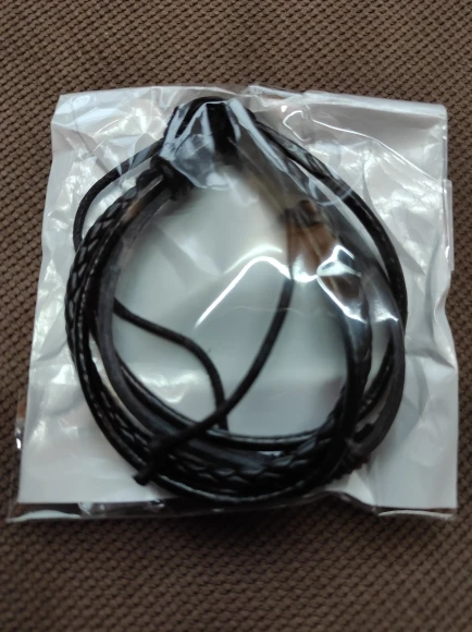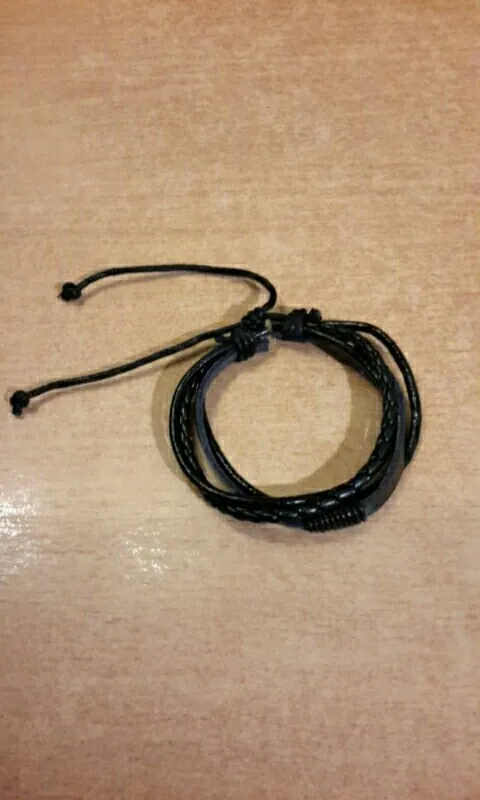 Симпатичный браслетик/фенечка. Толстый шнур - эко кожа, тонкий, вроде, натуральная кожа. Размер большой, на лезет на любое запястье, можно регулировать с помощью утяжки. Цвет темнее, чем выглядит на фото у продавца. Доставка - 3 недели до СПб. Всем доволен, прикольная штучка.