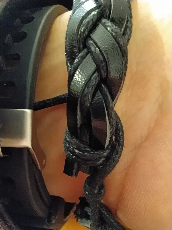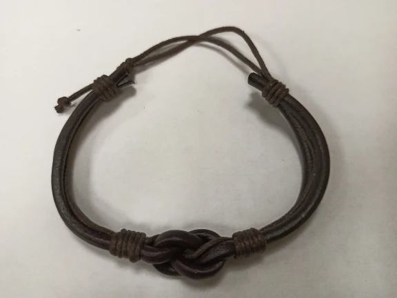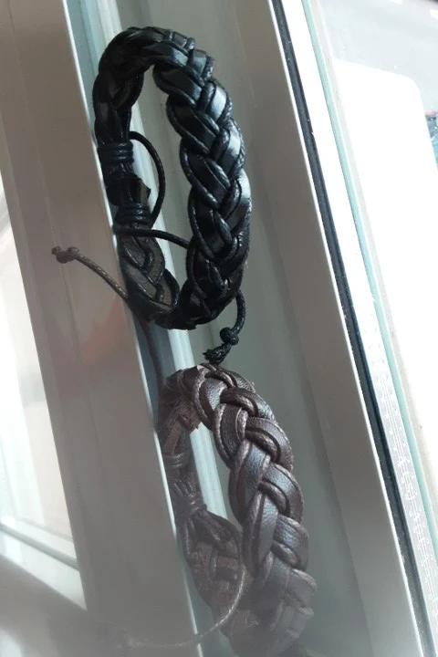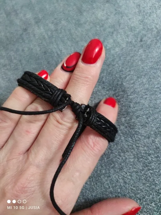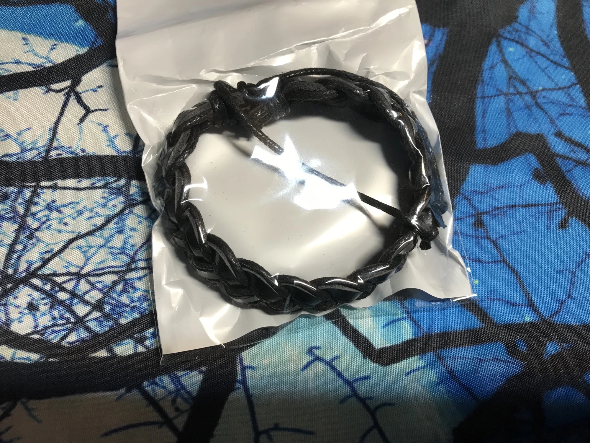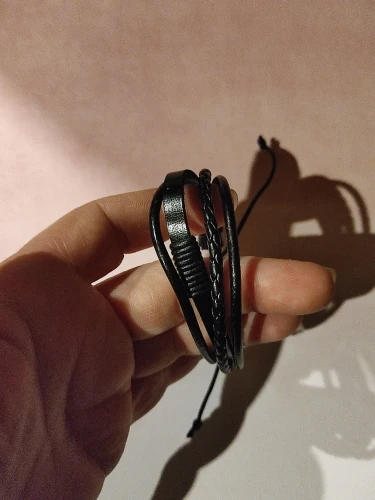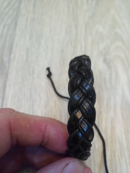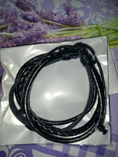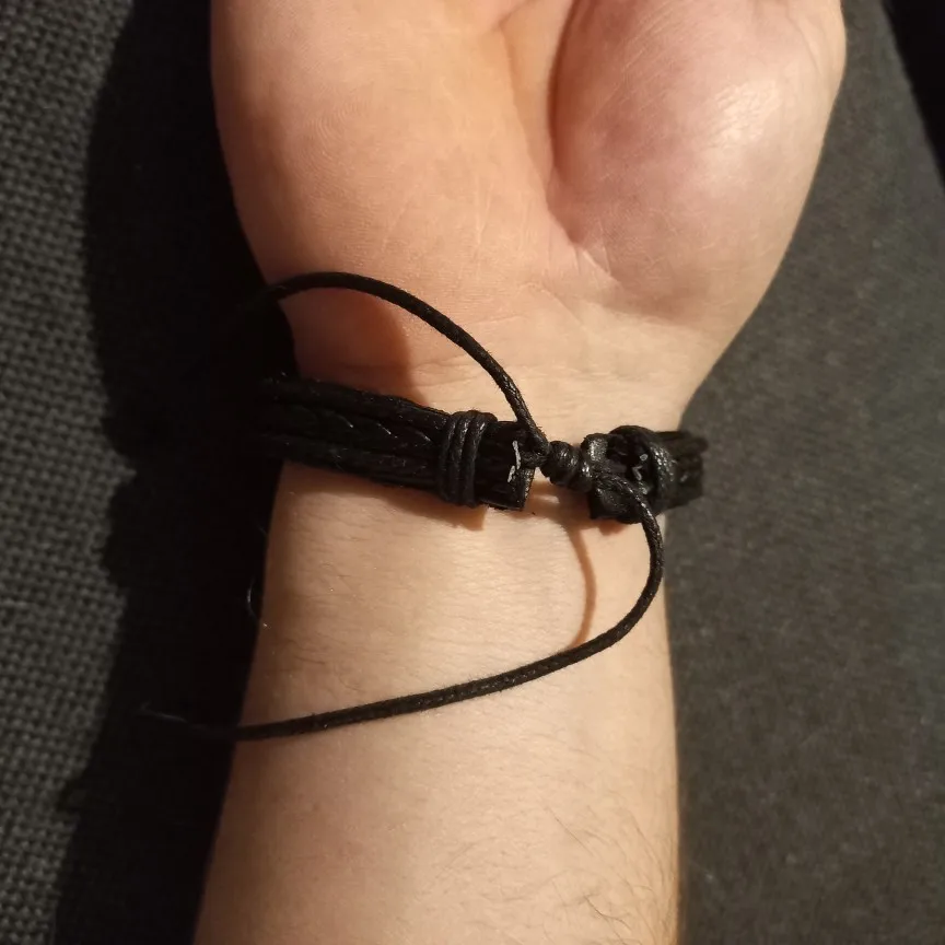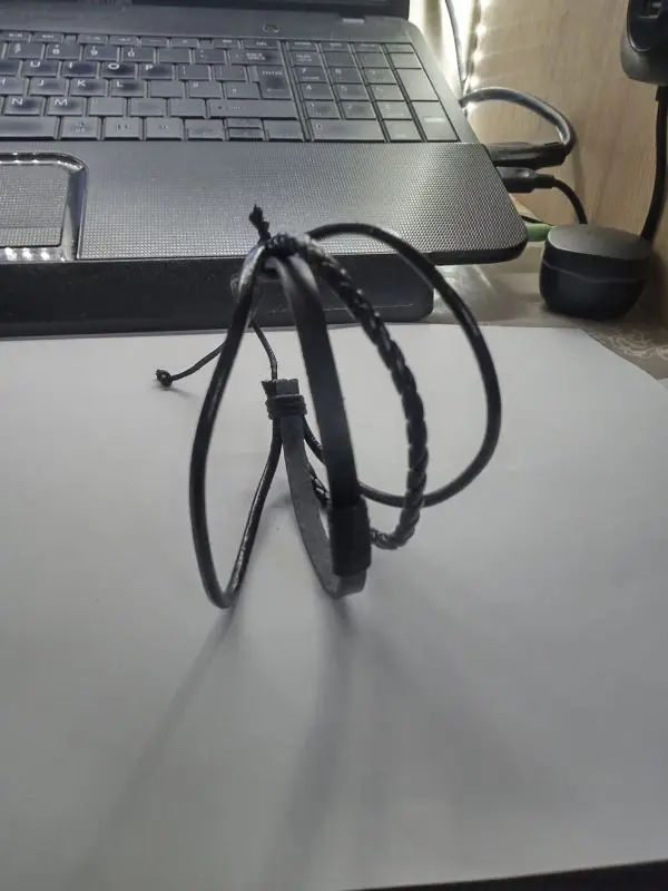 Симпатичный браслетик/фенечка. Толстый шнур - эко кожа, тонкий, вроде, натуральная кожа. Размер большой, на лезет на любое запястье, можно регулировать с помощью утяжки. Цвет темнее, чем выглядит на фото у продавца. Доставка - 3 недели до СПб. Всем доволен, прикольная штучка.