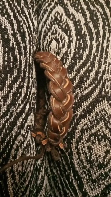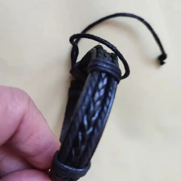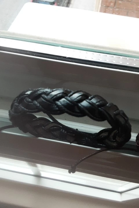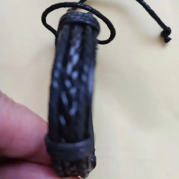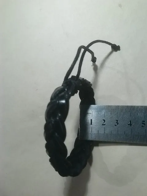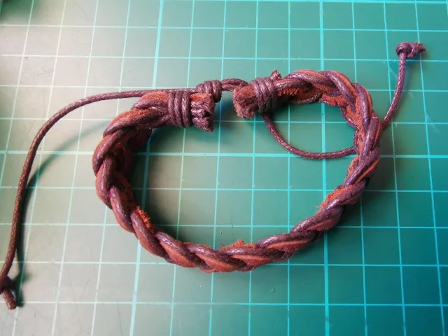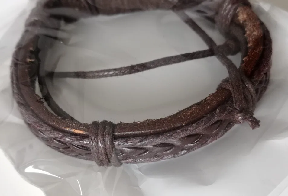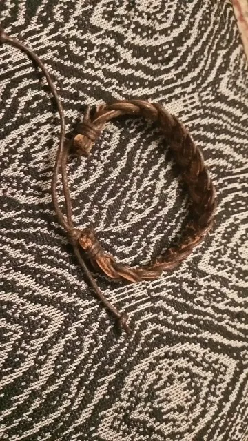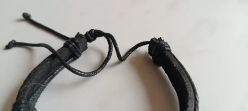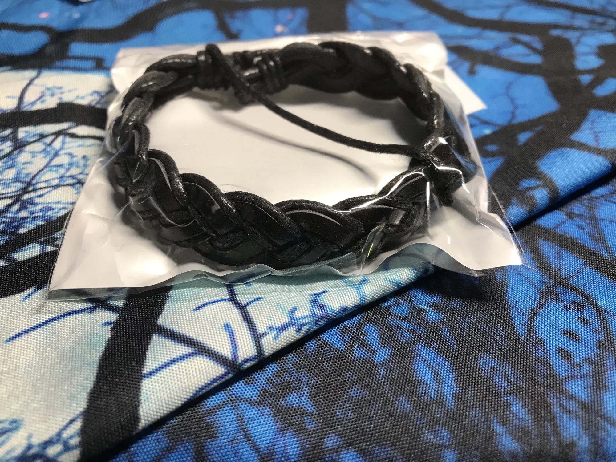 Симпатичный браслетик/фенечка. Толстый шнур - эко кожа, тонкий, вроде, натуральная кожа. Размер большой, на лезет на любое запястье, можно регулировать с помощью утяжки. Цвет темнее, чем выглядит на фото у продавца. Доставка - 3 недели до СПб. Всем доволен, прикольная штучка.