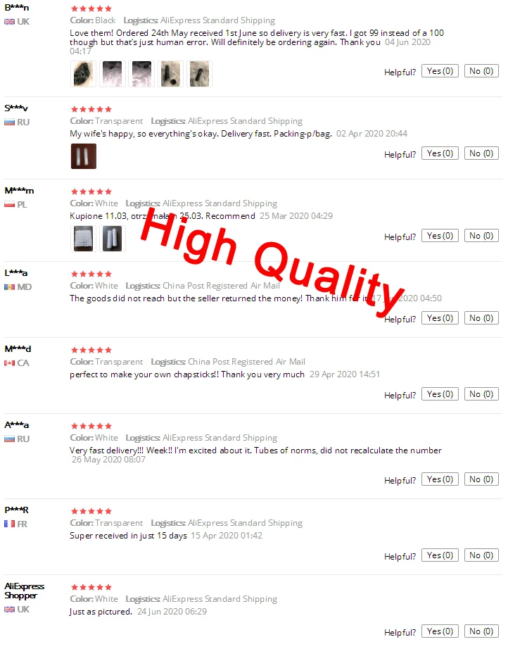 Я заказал прозрачные, упаковка 100, и это было не то, что рекламируется, те, которые я получил, 64 мм, а не 68 мм, и не имеют двойного кольца в крышке. Мне пришлось разрезать этикетки, чтобы они подходили мне, и я не был доволен получением чего-то отличного от того, что показано. Нет необходимости говорить, что я не буду заказывать их снова. К сожалению, я понял разницу только после того, как я надел этикетки на трубки, и к тому времени я уже наполнил несколько трубок, поэтому я думаю, что не могу вернуть их.