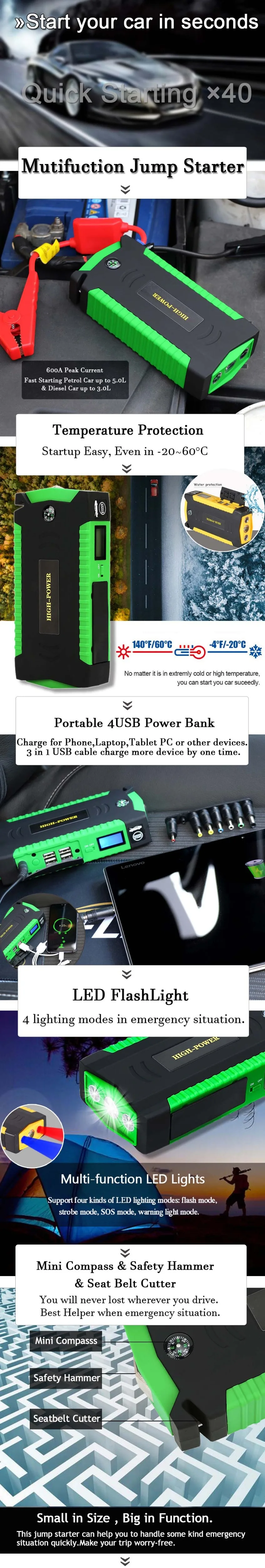 Описанию полностью соответствует. Заказал 6 января, получил 11-го, то есть очень быстро. Пришел заряженным на 80 процентов. Фонарик работает, гаджеты заряжает, автомобиль пока не пробовал. Попробую - отпишусь). Комплектность соответственно описанию. Рекомендую и товар, и продавца!)