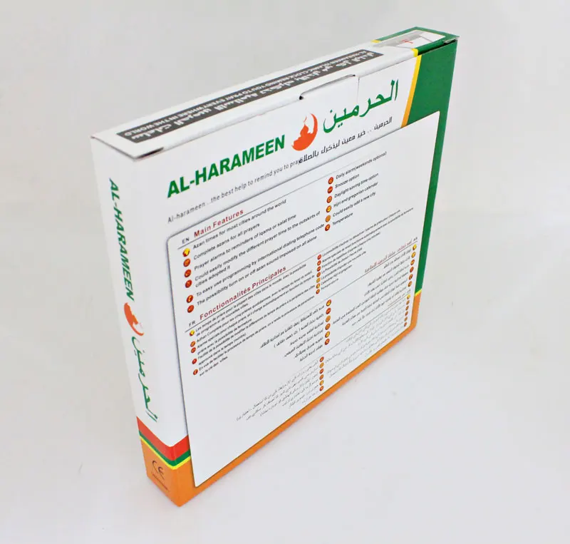 * Ежедневная Сигнализация: будильник на работу и в школу Ежедневная сигнализация-это обычная сигнализация, которая звонит одновременно каждый день. Кроме того, этот сигнал тревоги может не звонить в выходные дни. * Направление Qibla Может отображаться направление Qibla (относительно Севера). Угол Qibla также будет отображаться в диапазоне от 0 до 360 градусов по часовой стрелке с севера. * Календари Hijri и грегорианские Часы AL harameen могут отображаться как календари Hijr, так и григорианские каждые 10 секунд, или вы можете выбрать один из них, нажмите H-G при отображении. Календарь Hijri повторяет григорианскую дату и основан на астрономическом наблюдении за луной в Мекке. * Отображение температуры Показания температуры в градусах Цельсия (°C) и фахаратен (°F) отображаются. * Вариант повтора * Внешний вход постоянного тока 6 Вольт 300 мА * Аудиовыход (соединение с динамиком) * Вариант летнего времени (для стран, использующих эту систему) * Напоминание о нежных молитвах (при выключенном звуке azan) * Легко можно добавить новый город (информация о долготе, долготе и GMT) * Может легко изменить время молитвы в окраине принятых городов * Громкий звук: все сигналы тревоги имеют нежный звук пробуждения, который постепенно увеличивается * Одноразовый будильник, в дополнение к Fajr и ежедневным будильникам, AL-HARAMEEN часов включают дополнительный будильник (называемый однодневным будильником). Можно установить кольцо для специальных встреч. * Информация об упаковке Размер продукта: 227*32*215 мм