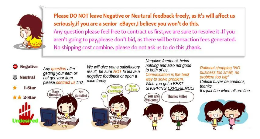 1.Отзывы очень важны, мы надеемся, что вы сможете связаться с нами, прежде чем оставить нейтральный или отрицательный отзыв, чтобы мы могли сделать все возможное, чтобы Вы остались довольны. Отрицательотзывы в не может решить никаких проблем, если мы не решим проблему.