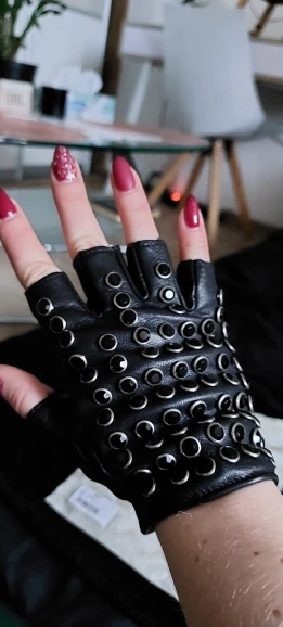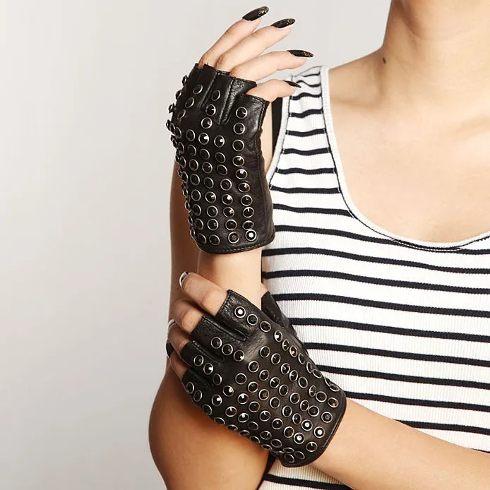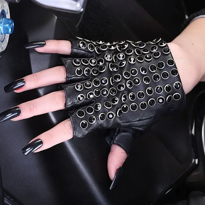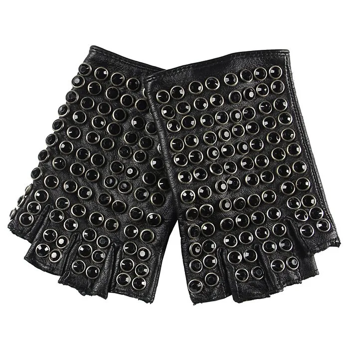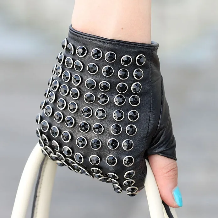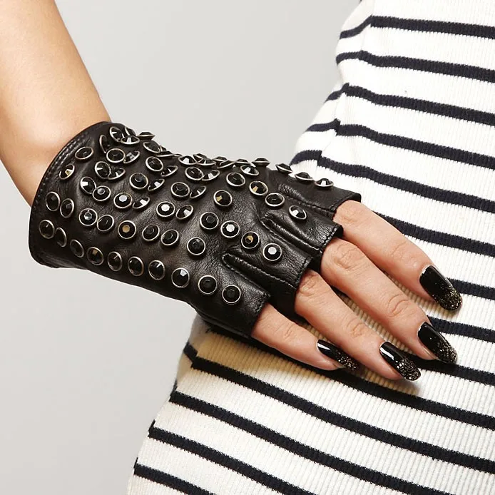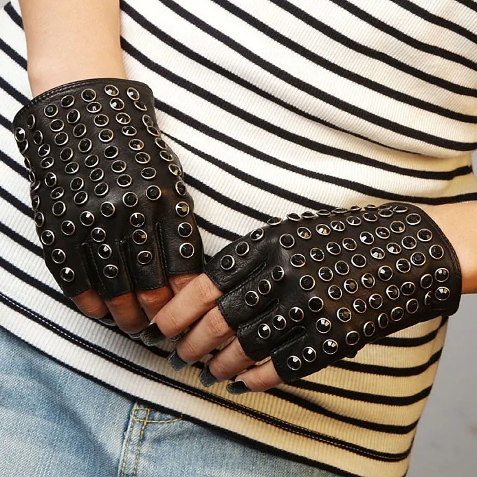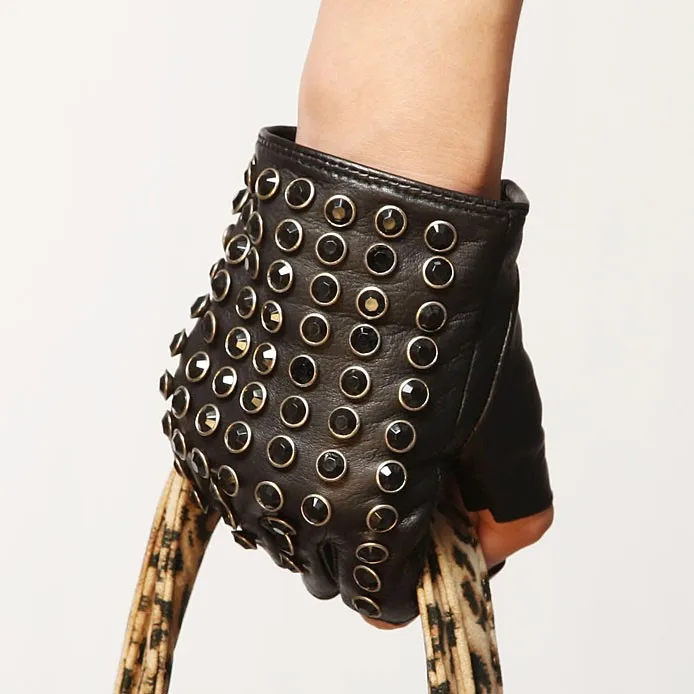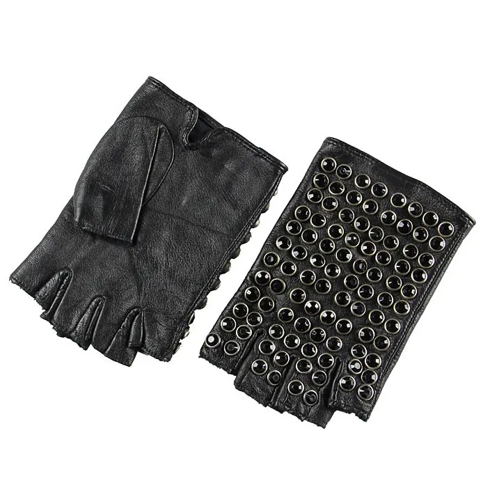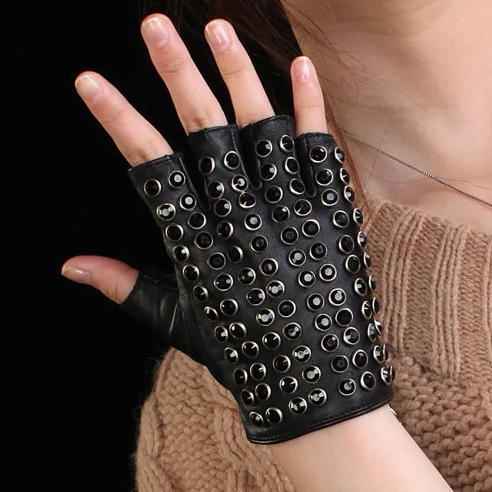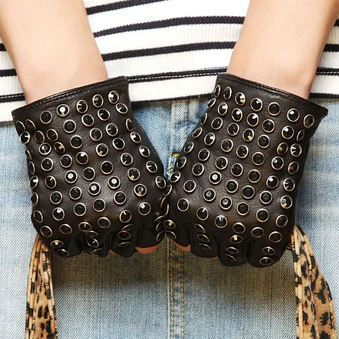 Бесплатная доставка, женские перчатки из натуральной кожи, черные варежки на половину пальца, модные панковские перчатки из овчины, стразы, перчатки для вождения, L116