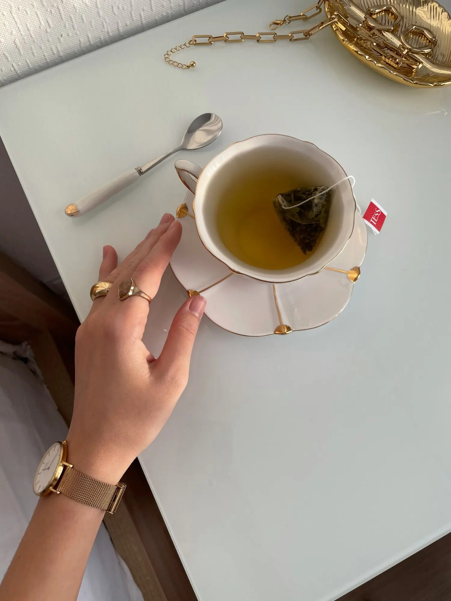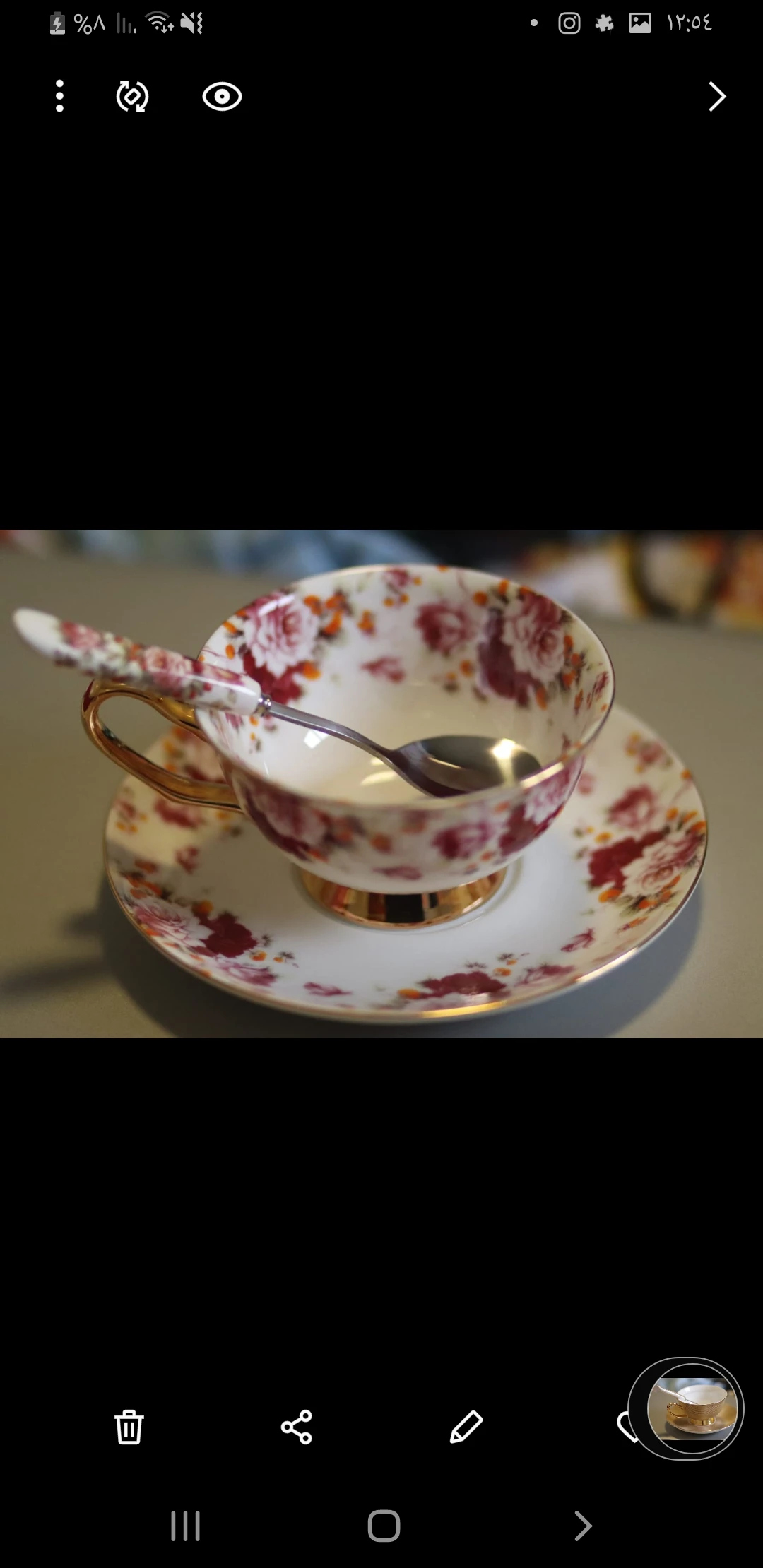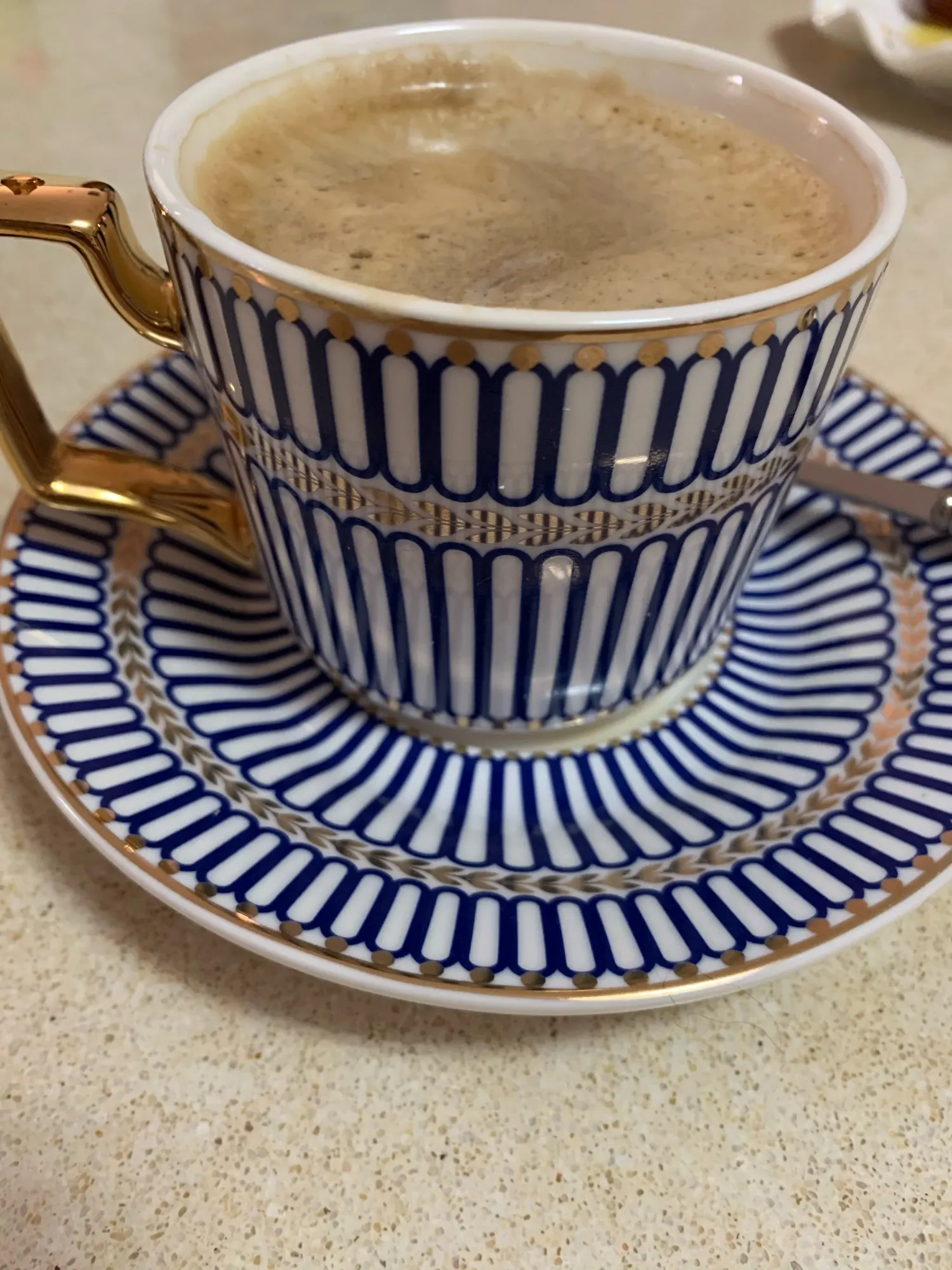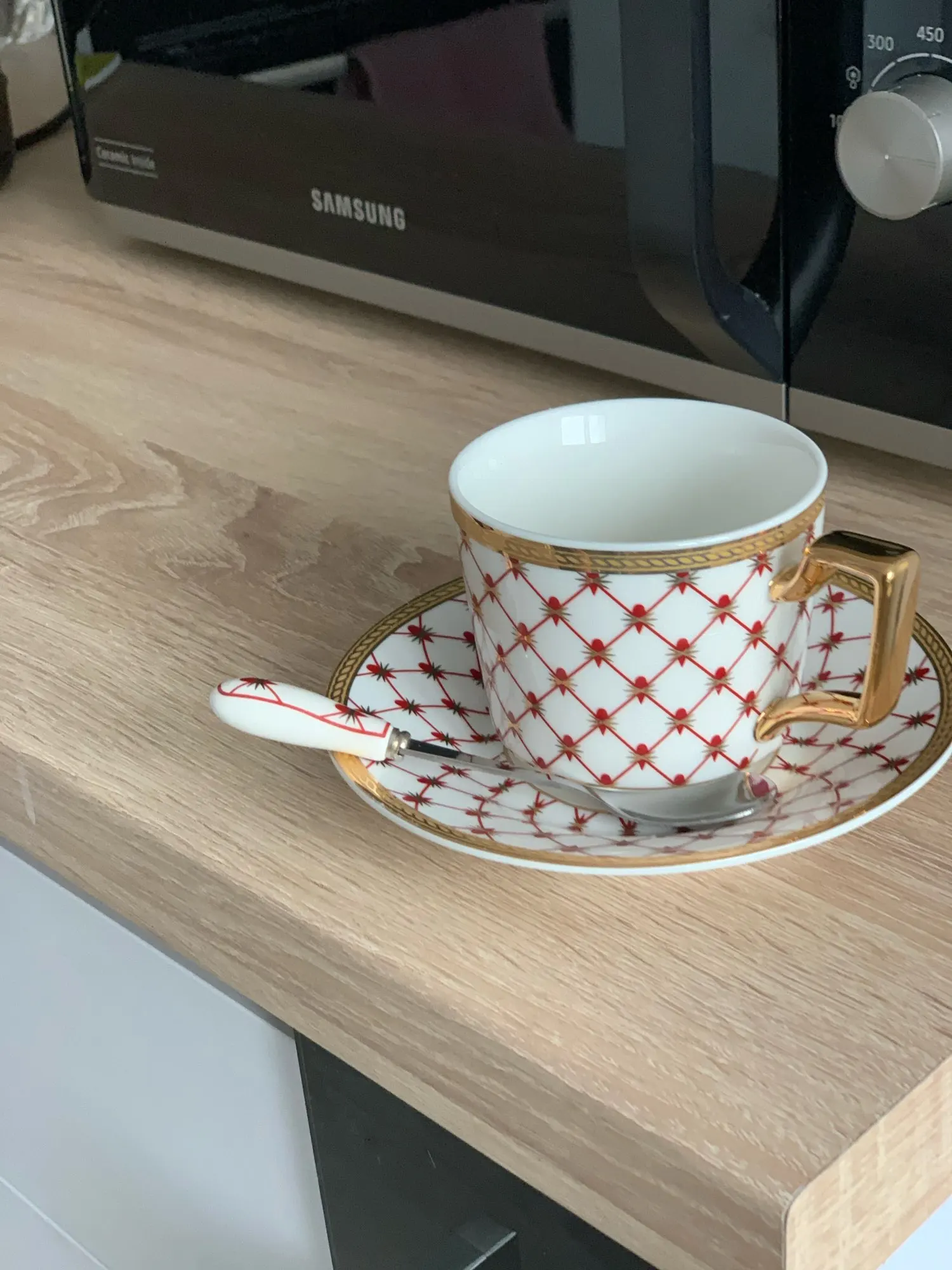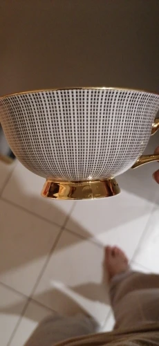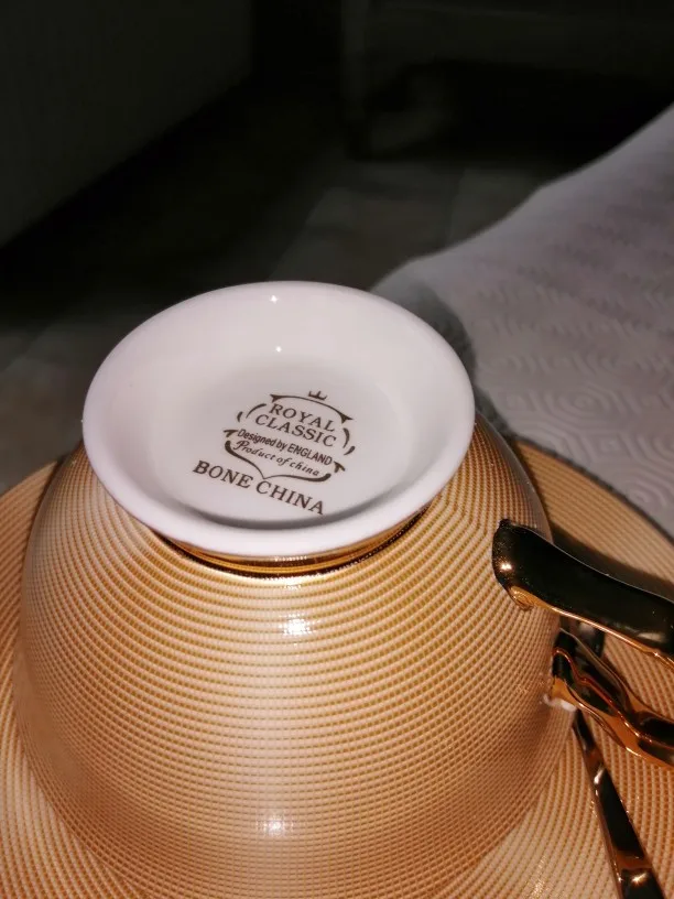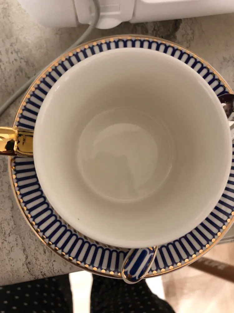 Он идентичен фото, он больше на человека, хороший размер. Только то, что вы не можете положить чашку в микроволновую печь, так как вы просвечиваете искры через золотую чашку, вам нужно нагревать воду, а затем бросать ее в чашу :) доволен продуктом