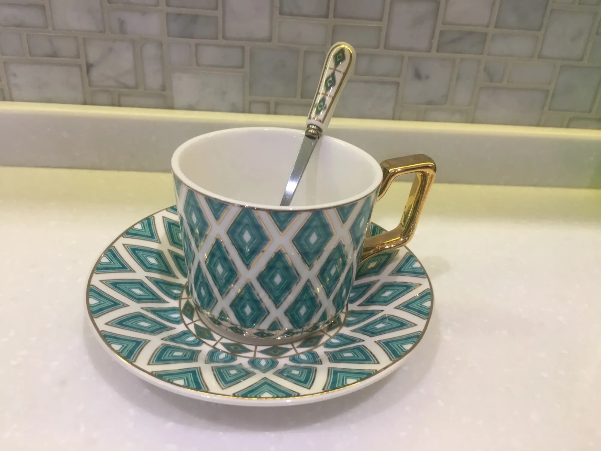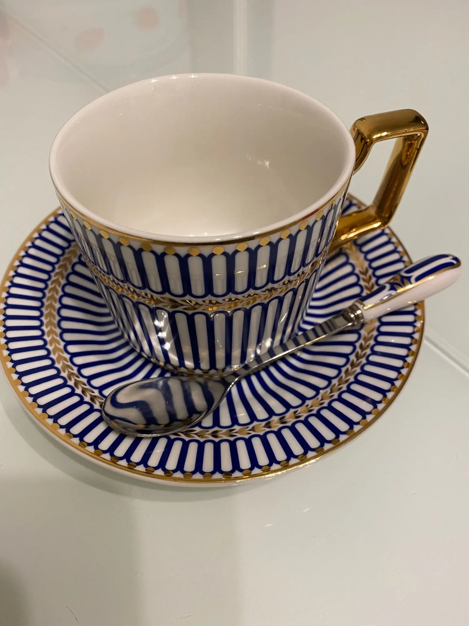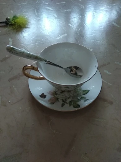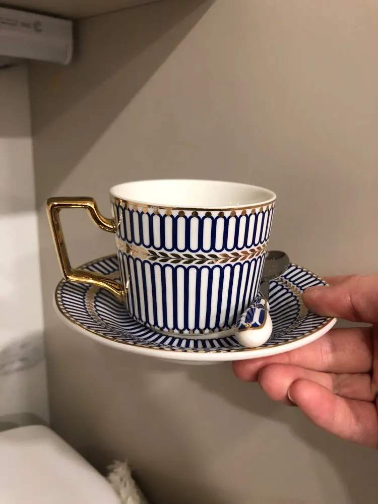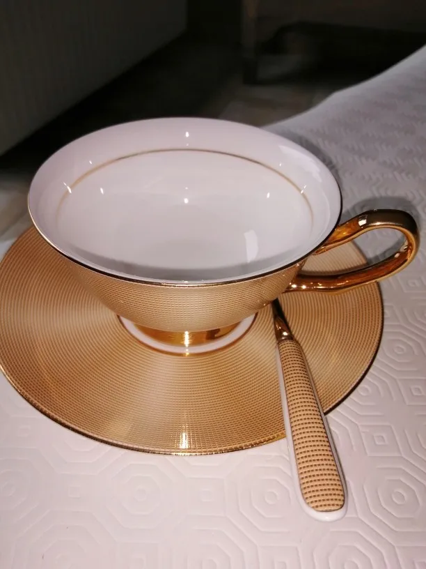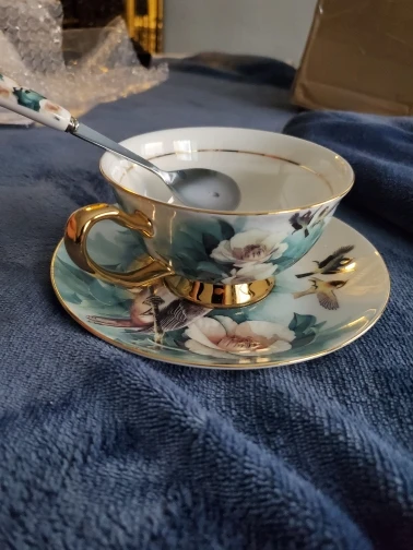 Очень красивый набор (чашка, блюдце и ложечка) смотрится дорого. Отличный вариант для подарка. Быстрая доставка, упакован хорошо.