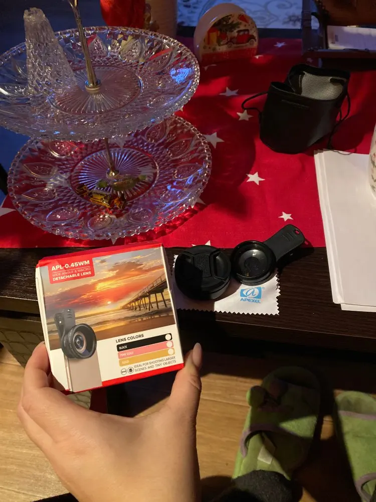 Заказ пришёл во время , в срок как и было написано при отправке, коробка целая, все в сохранности, в наборе макро линза и широкоформатная, чехол и салфетка для протирания. Линза крутая, для моего телефона плохого качества очень даже хорошо фотографирует) Использую для фото ногтей