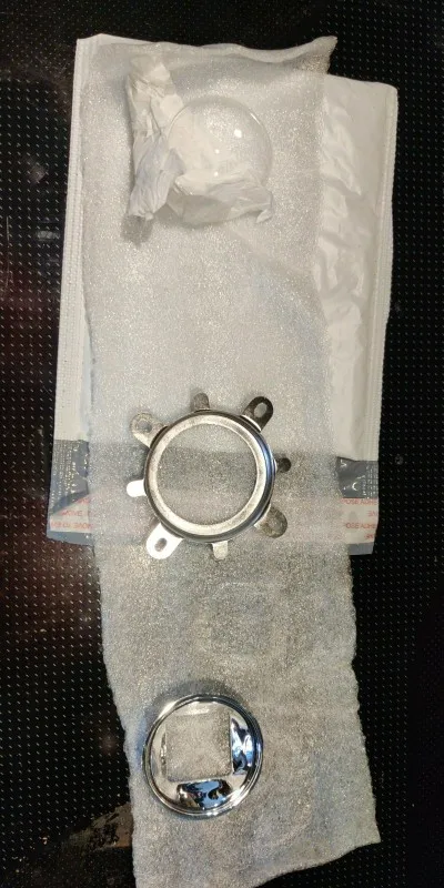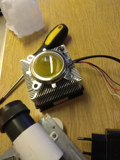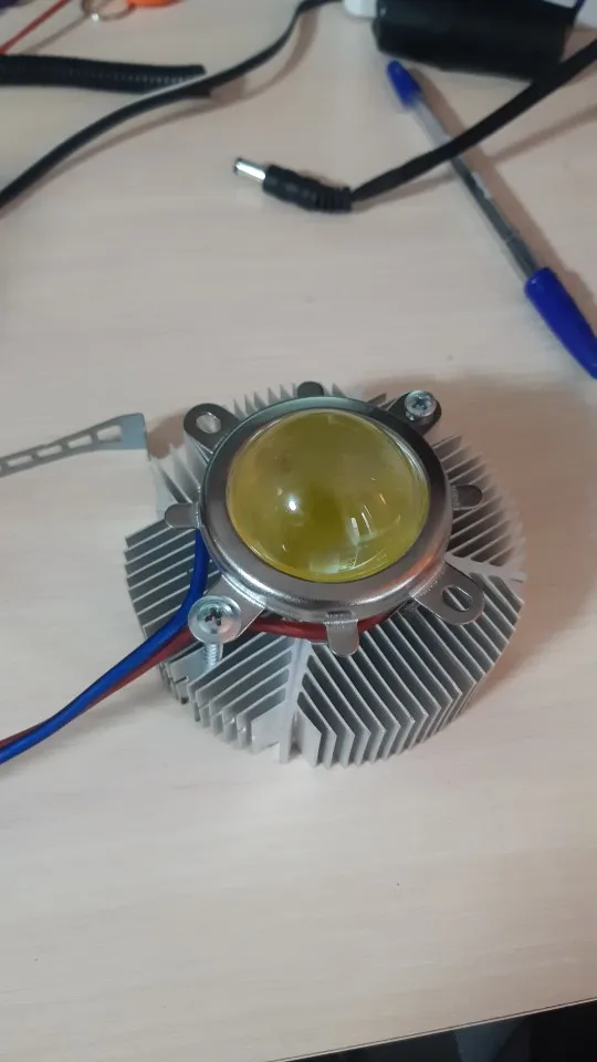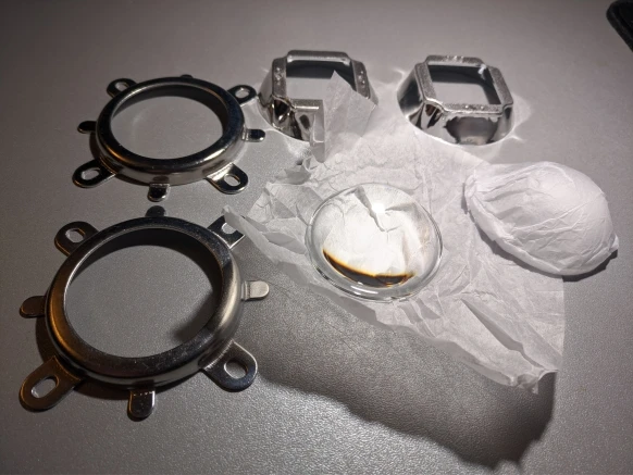 отражатель пластик, лиза стекло, кольцо крепления алюминий. тражатель встает в паз светодиода, у меня светодиод на 100вт, скорее всего под него и сделан. во время свечения по контору желтое кольцо, полагаю это из за линзы. своих денег стоит, пучек света хороший.