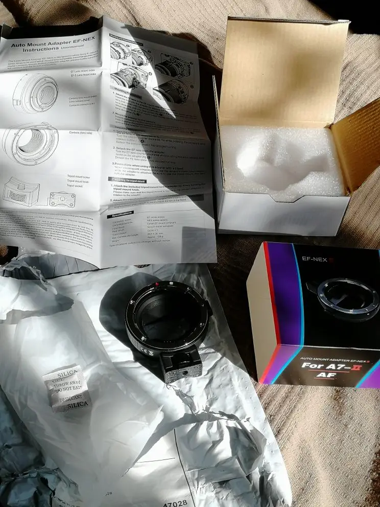 Приехал с доставкой по России всего за 3(!!!) дня СДЭК-ом. Автофокус медленно, но вполне корректно работает. Пробовал с Canon 50мм с камерой a6000. В атрибутах файла вполне правильно прописываются диафрагма и фокусное расстояние Доволен вполне покупкой.