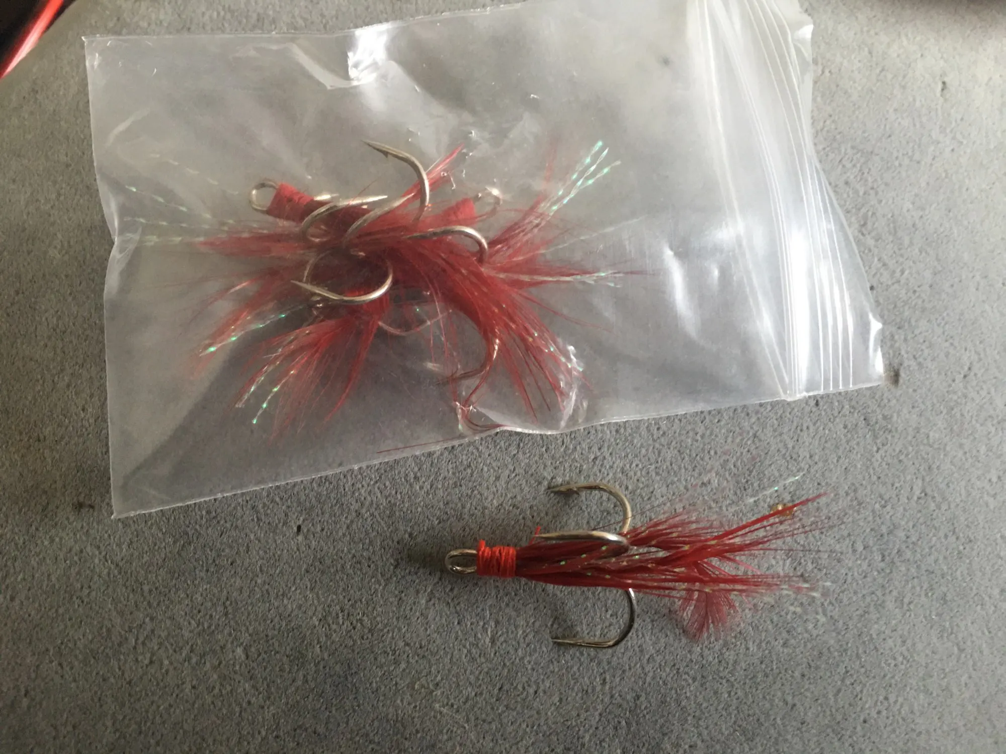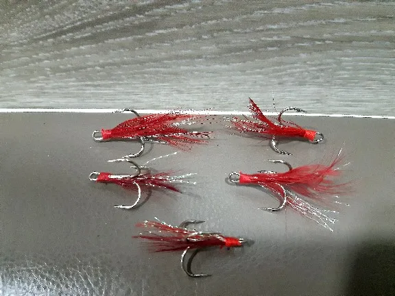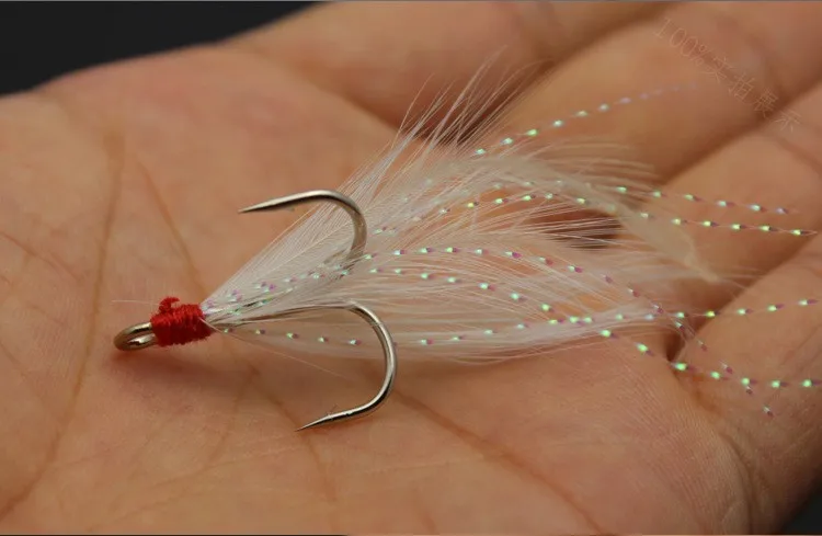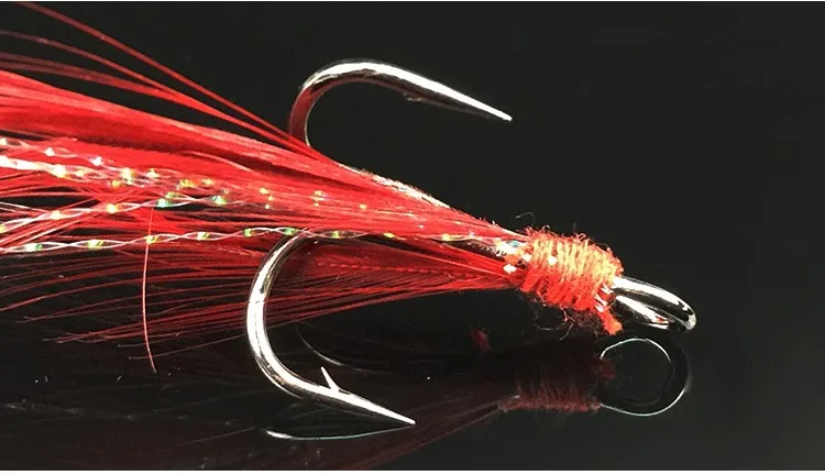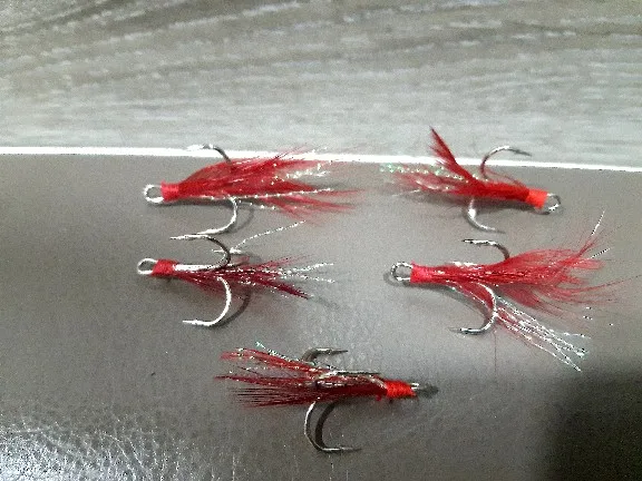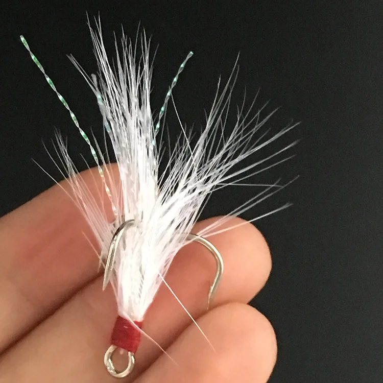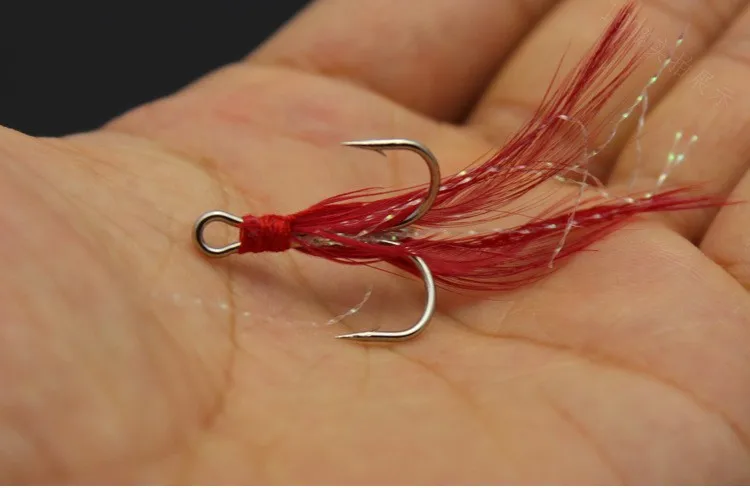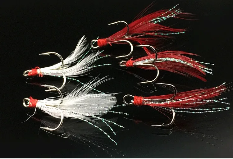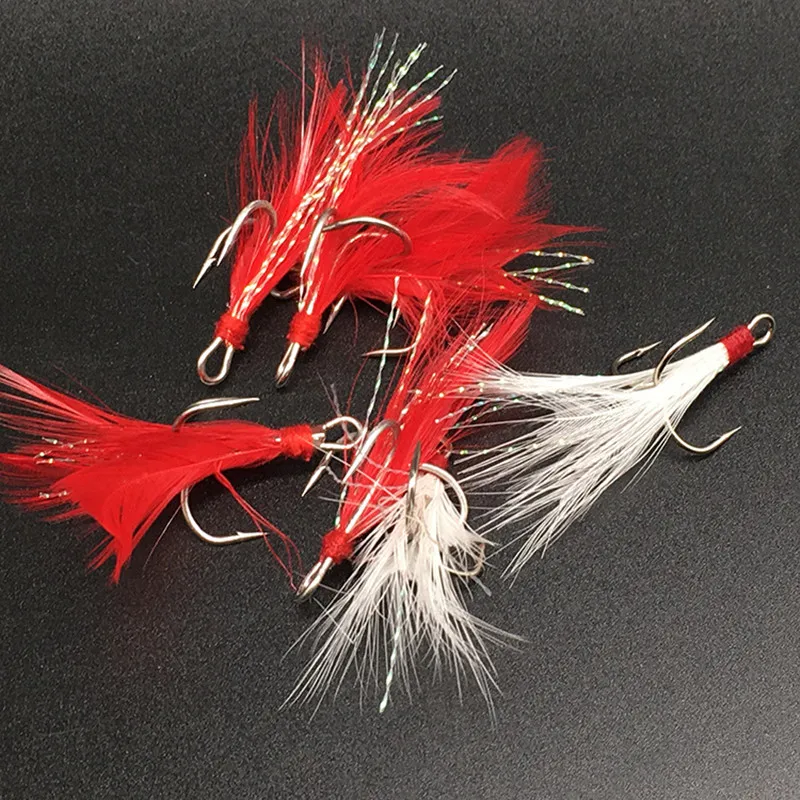 Рыболовные приманка с тройным крючком, рыболовные крючки с красными и белыми перьями, круглые базовые крючки, размер 2, 4, 6, 8, 10, 5 шт. в партии