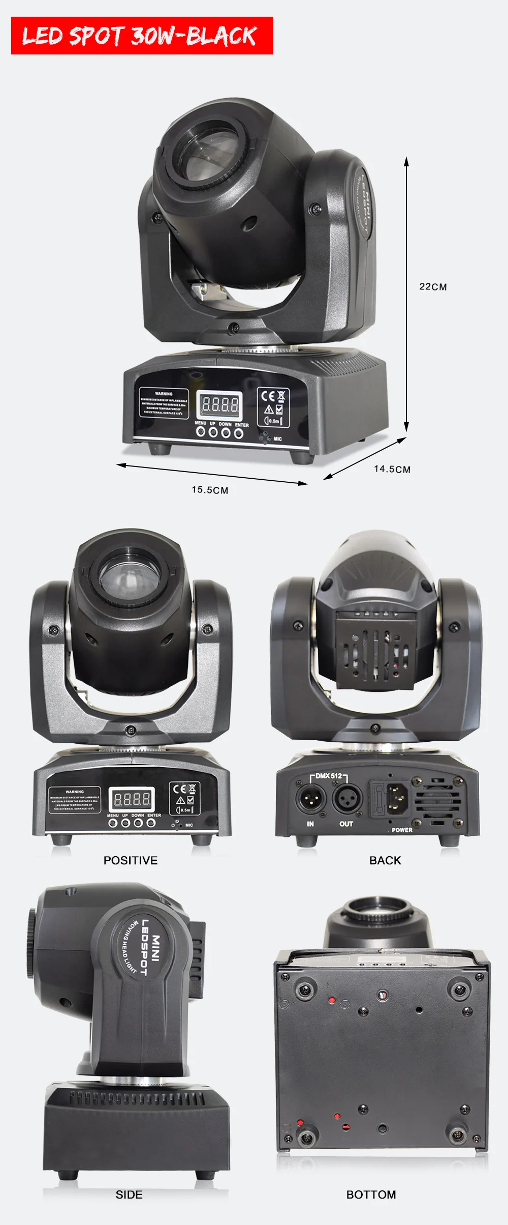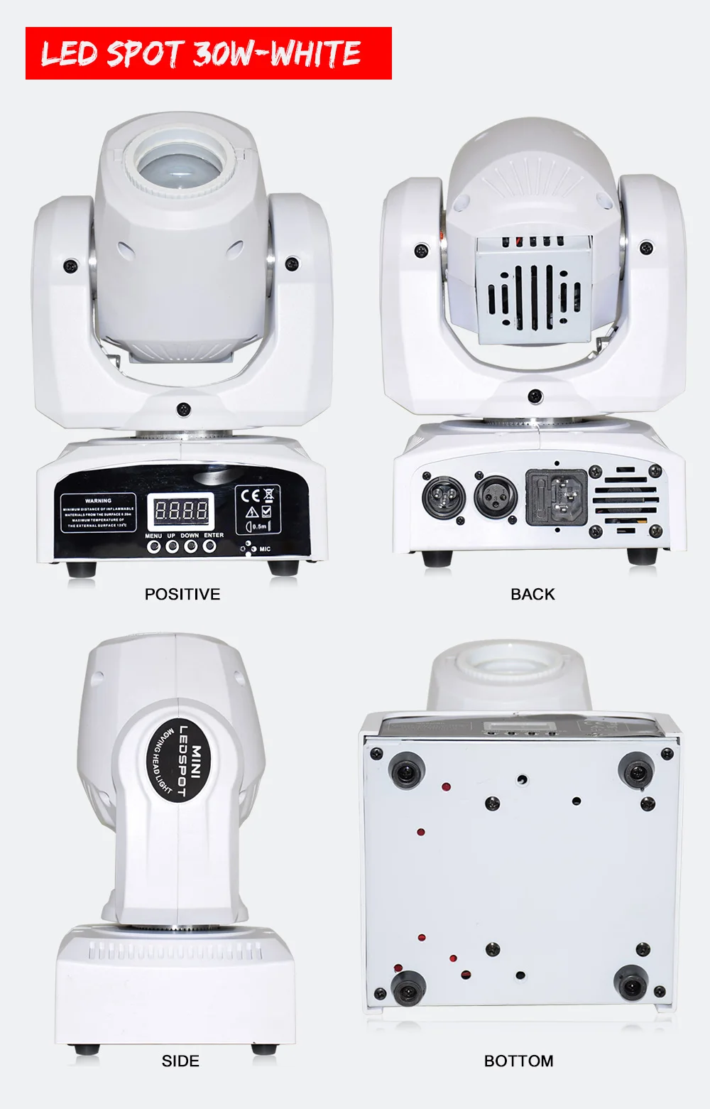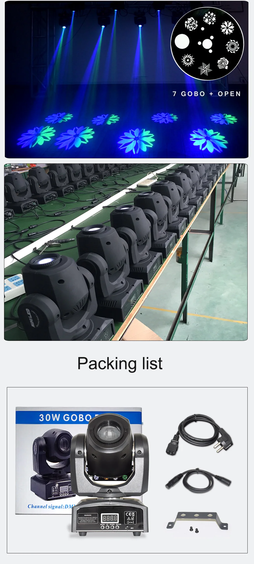 -Высокая Выходная мини-головка с ярким белым 30 Вт светодиодный источник-7 цветов + белый-7 фиксированных gobos + spot-Отдельные цвета и колеса gobo-Ручной фокус-3 режима работы: DMX, звук активный и внутренний режим управления шоу-2 режима канала DMX: 9/11 режимов канала-4 встроенных шоу-Эффект дрожания Gobo-Режим Прокрутки Gobo-Размер Gobo: 74 мм (15 мм видимый)-Угол луча: 13 градусов-540 ° панорамирование/230 ° Наклон (16 бит)-Режим панорамирования/наклона-5 выбираемых тусклых кривых (стандартный, сценический, ТВ, архитектурный и театральный)-Затвор: Импульсный эффект; Случайный стробоскоп медленного до быстрого-Затемнение: 0% - 100%-Охлаждение вентилятора-Режим инверсии дисплея-Омега кронштейн в комплекте-Соединчющаяся между собой: DMX через 3-pin XLR кабель-Управление: включение, включение, стробоскоп, изменение цвета, затемнение, включение/выключение звука.-Потребляемая мощность: 50 Вт @ 120 В, 60 Вт @ 230 В-Мульти-напряжение Управление: AC 100 - 240 В пер. тока, 50/60 Гц-Светодиодный источник: 30 Вт белый светодиодный источник света (Номинальная составляет примерно 50000 часов)-Размеры (ДхШхВ): 159x147x265 мм-Вес: 3 кг