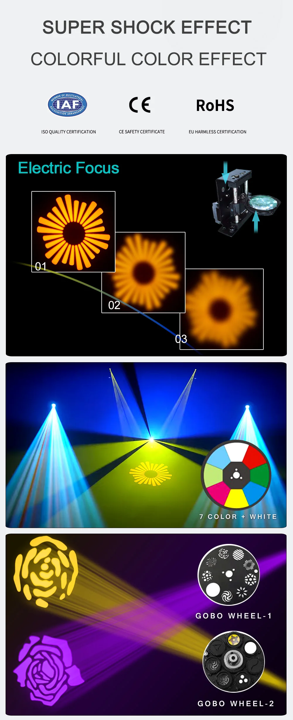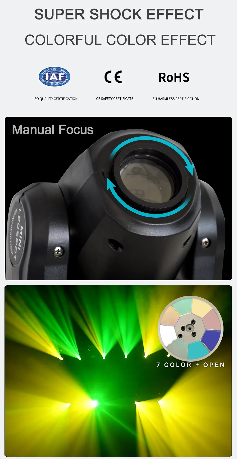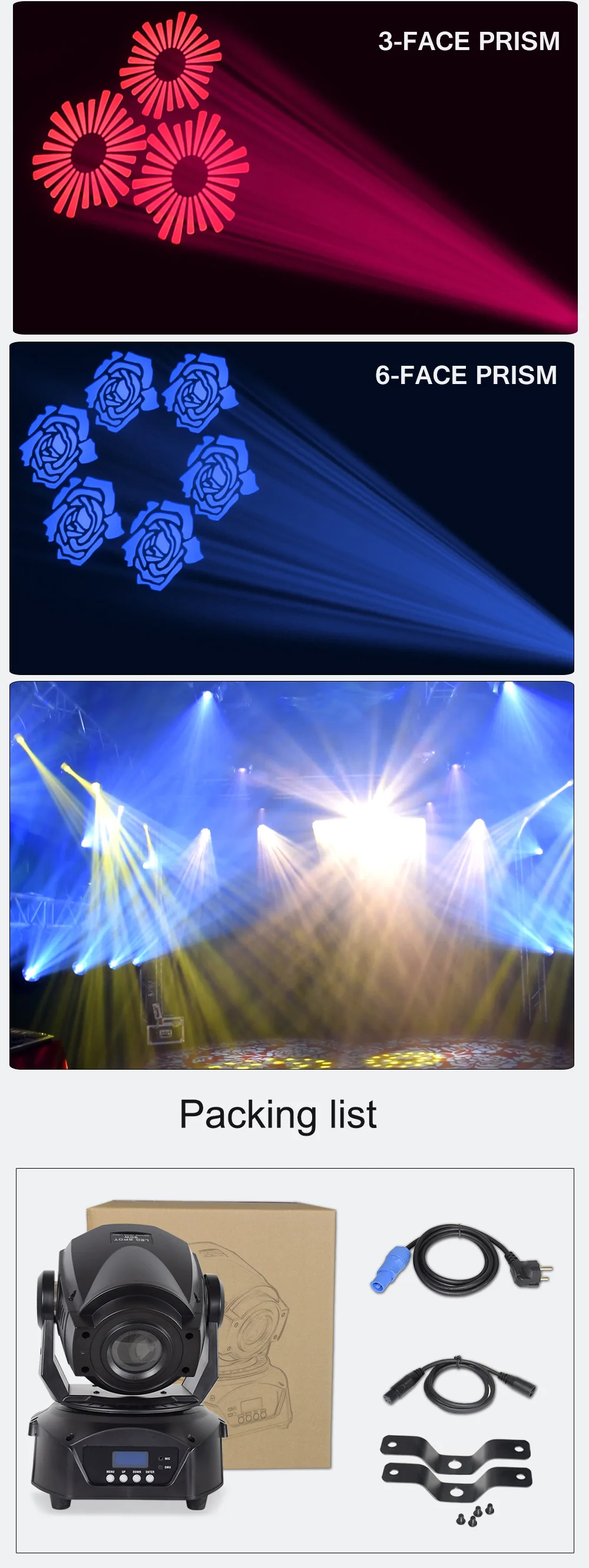 -Высокая Выходная мини-головка с ярким белым 30 Вт светодиодный источник-7 цветов + белый-7 фиксированных gobos + spot-Отдельные цвета и колеса gobo-Ручной фокус-3 режима работы: DMX, звук активный и внутренний режим управления шоу-2 режима канала DMX: 9/11 режимов канала-4 встроенных шоу-Эффект дрожания Gobo-Режим Прокрутки Gobo-Размер Gobo: 74 мм (15 мм видимый)-Угол луча: 13 градусов-540 ° панорамирование/230 ° Наклон (16 бит)-Режим панорамирования/наклона-5 выбираемых тусклых кривых (стандартный, сценический, ТВ, архитектурный и театральный)-Затвор: Импульсный эффект; Случайный стробоскоп медленного до быстрого-Затемнение: 0% - 100%-Охлаждение вентилятора-Режим инверсии дисплея-Омега кронштейн в комплекте-Соединчющаяся между собой: DMX через 3-pin XLR кабель-Управление: включение, включение, стробоскоп, изменение цвета, затемнение, включение/выключение звука.-Потребляемая мощность: 50 Вт @ 120 В, 60 Вт @ 230 В-Мульти-напряжение Управление: AC 100 - 240 В пер. тока, 50/60 Гц-Светодиодный источник: 30 Вт белый светодиодный источник света (Номинальная составляет примерно 50000 часов)-Размеры (ДхШхВ): 159x147x265 мм-Вес: 3 кг