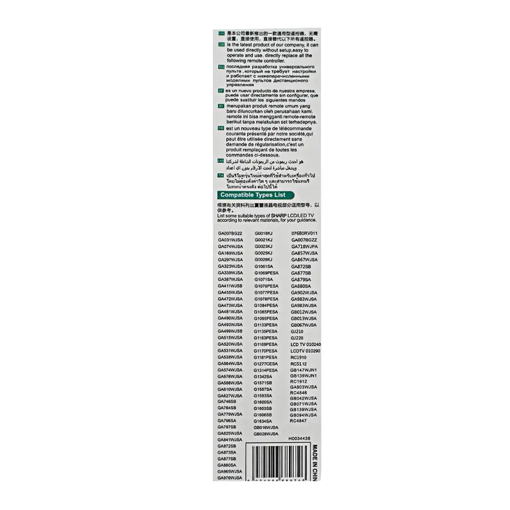 Я использую этот пульт дистанционного управления для телевизора Sharp Aquos. Он работает как оригинальный! Он не требует какого-либо набора или контроля кода, просто вставьте батарею и играйте. Прекрасно работает и стоит в десять раз меньше, чем оригинал! Очень, очень дешево. Кроме того, продавец с одобрением в чате был удовлетворен.