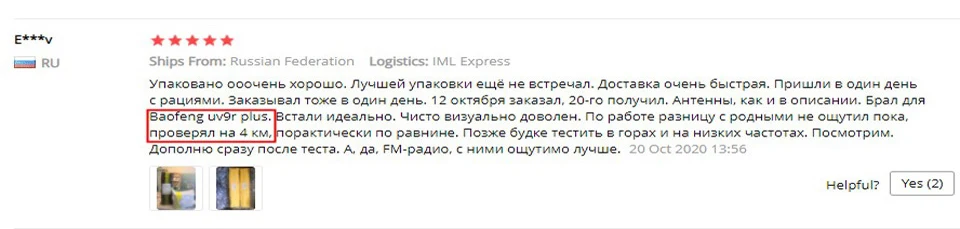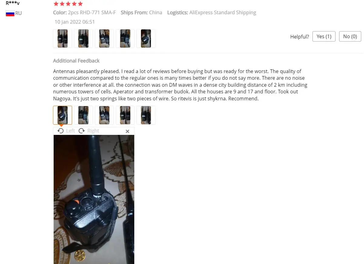 Очень хорошее качество прибыло очень быстро (12 дней в Новую Зеландию), быстрее всего, я все еще жду вещи от 2 месяцев назад. Безусловно увеличивает четкость сигнала и диапазон. Прилагается к моей baofeng uv5r