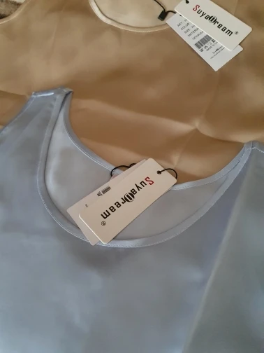 я заказывала у этого продавца, в этом же магазине два года назад две майки. Они были просто шикарные. заказала в этом году 4 майки. Просто ужасно!! во-первых они пришли меньше, чем указано у продавца. Размер S у продавца грудь 87см мне пришло 82. Естественно все майки мне малы. во-вторых ткань оооооочень тонкая и просвечивает. Вытачек на груди нет и майка естественно жутко сидит. В общем я очень разочарована. За такие деньги этот кусок подкладки вообще нет смысла заказывать. И ткань на ощупь далеко не шелк, а такая дешёвая, тонкая синтетика, как подюбник.