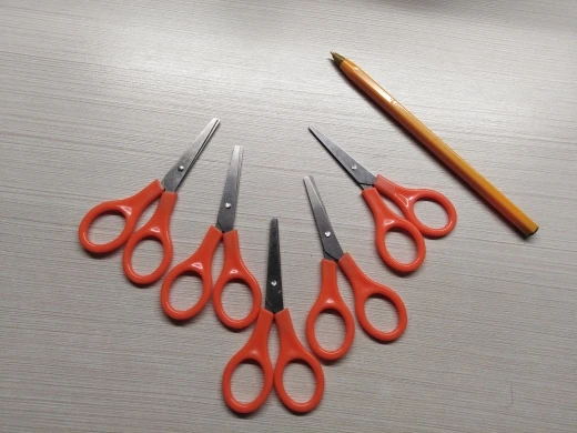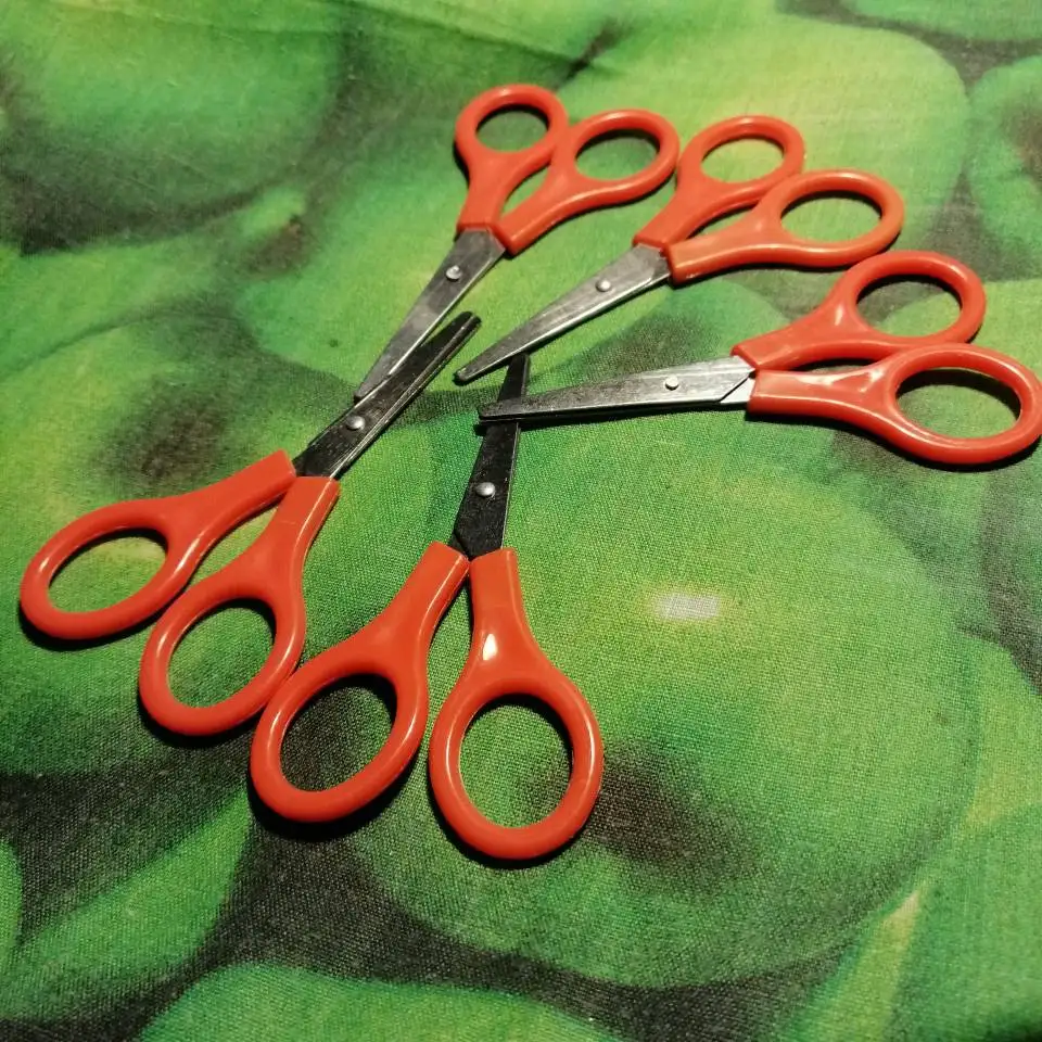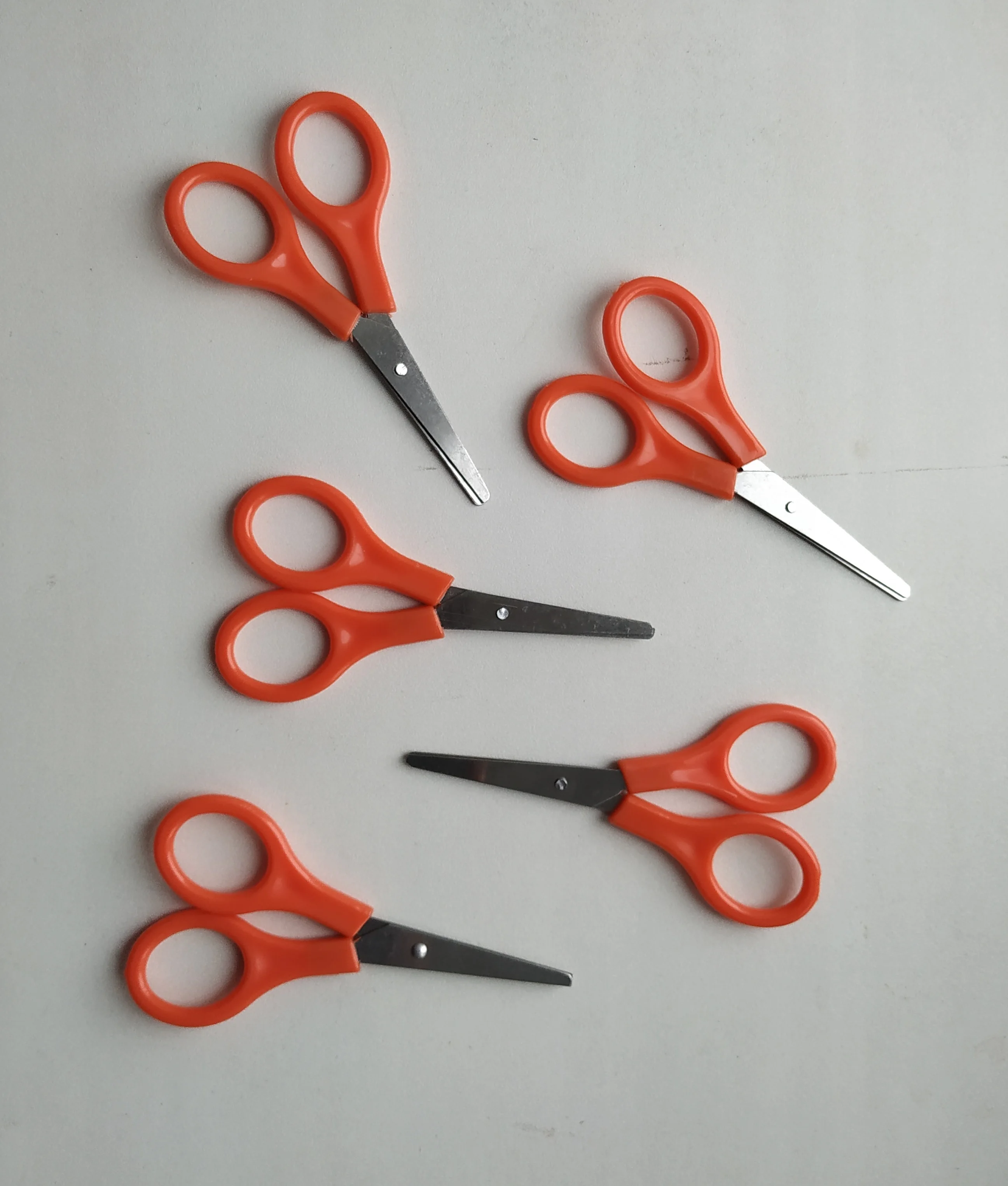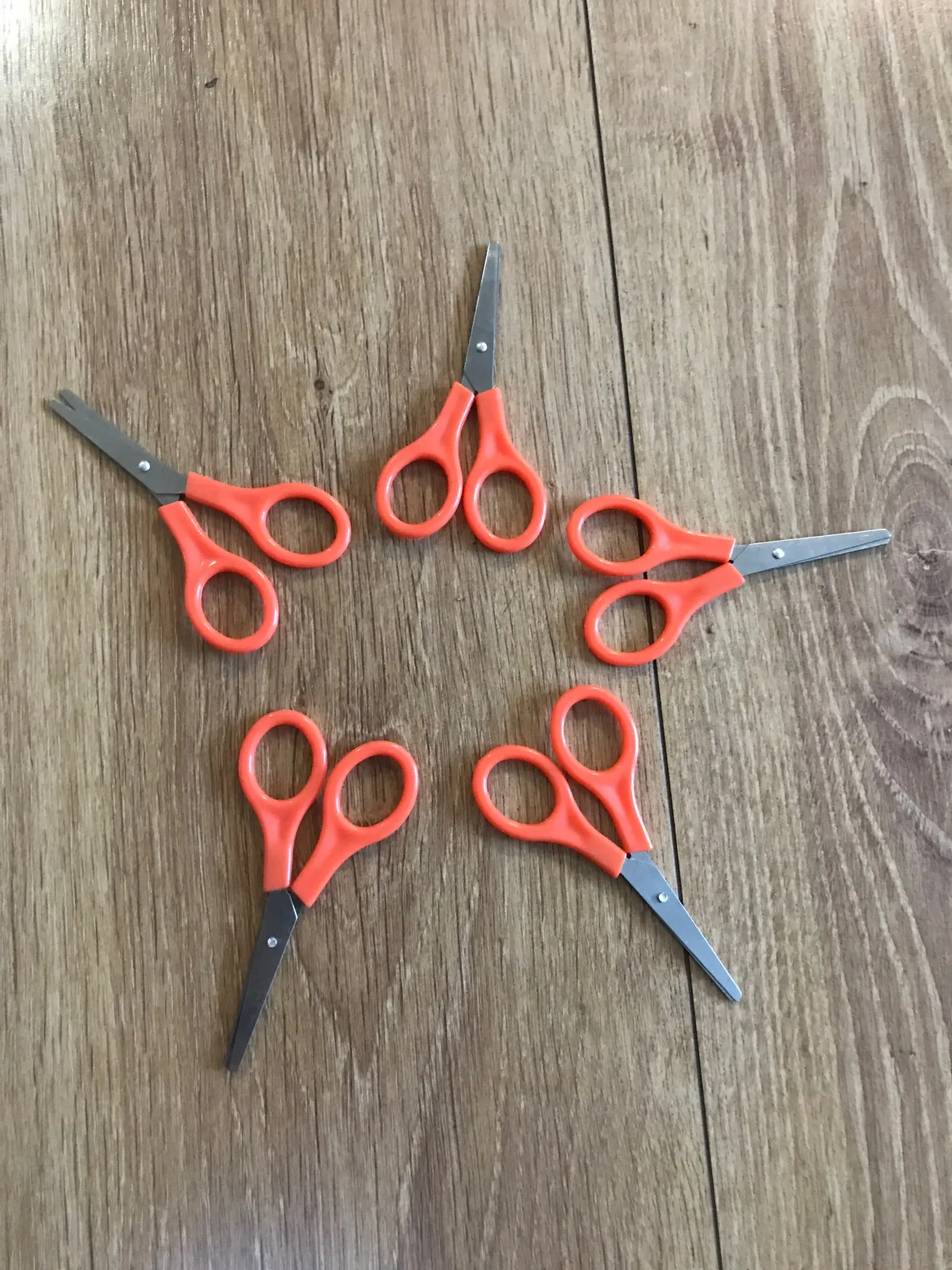 5 шт, на удивление хорошего качества. Острые. Для маленьких детей стричь бумагу и ткань - самое оно.