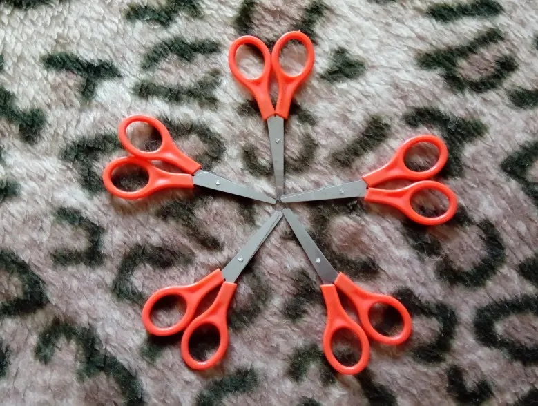 Прислали примерно через месяц. За такую цену пять штук, ну это просто даром. Не ждите многое от этих ножничек, больше подойдут для детей, делать бумажные поделки, так как они хорошо режут бумагу, ткань и нитки. Кончики в ножницах не острые а закругленные, что безопасно для детей.